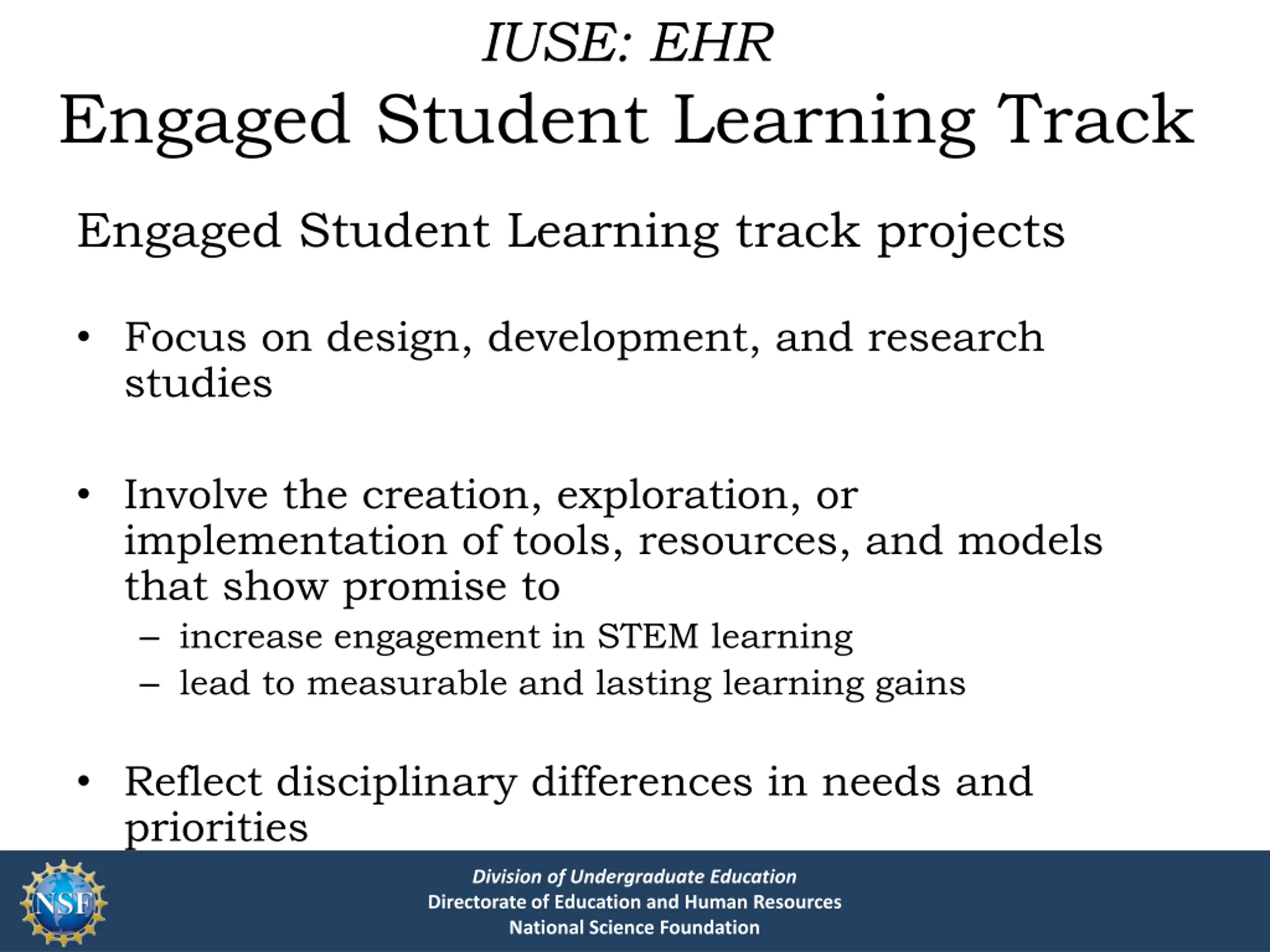 IUSE: EHR Engaged Student Learning Track Engaged Student Learning track projects Focus on design, development, and research studies Involve the creation, exploration, or implementation of tools, resources, and models that show promise to increase engagement in STEM learning lead to measurable and lasting learning gains Reflect disciplinary differences in needs and priorities Division of Undergraduate Education Directorate of Education and Human Resources National Science Foundation