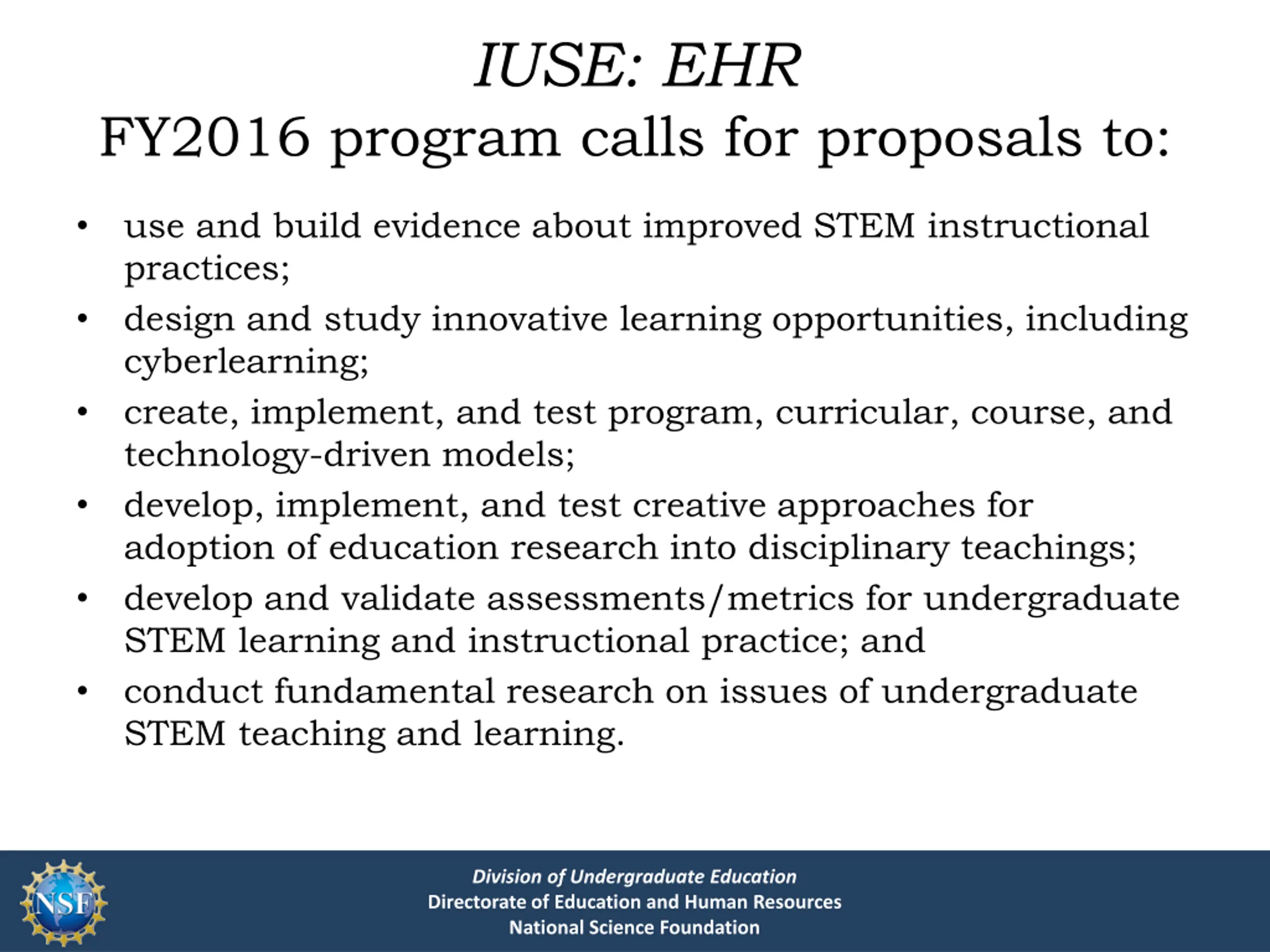 IUSE: EHR FY2016 program calls for proposals to: use and build evidence about improved STEM instructional practices; design and study innovative learning opportunities, including cyberlearning; create, implement, and test program, curricular, course, and technology-driven models; develop, implement, and test creative approaches for adoption of education research into disciplinary teachings; develop and validate assessments/metrics for undergraduate STEM learning and instructional practice; and conduct fundamental research on issues of undergraduate STEM teaching and learning. Division of Undergraduate Education Directorate of Education and Human Resources National Science Foundation