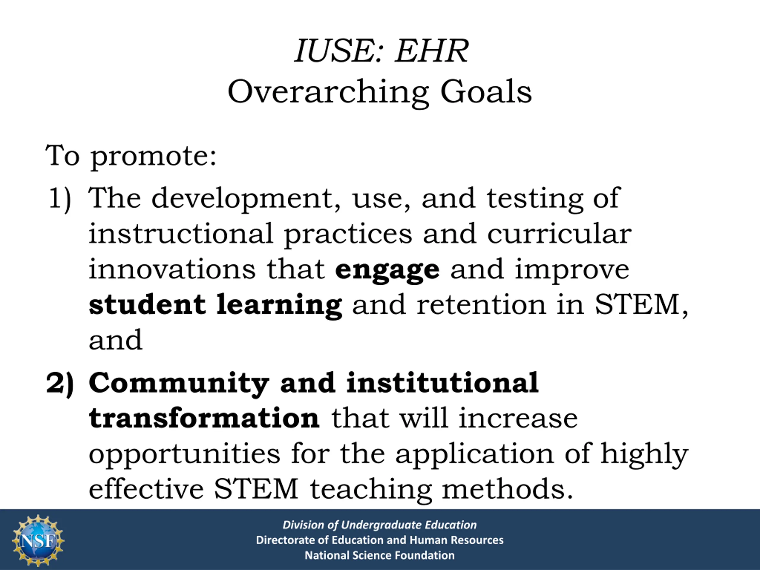 IUSE: EHR Overarching Goals To promote: 1) The development, use, and testing of instructional practices and curricular innovations that engage and improve student learning and retention in STEM, and 2) Community and institutional transformation that will increase opportunities for the application of highly effective STEM teaching methods. Division of Undergraduate Education Directorate of Education and Human Resources National Science Foundation