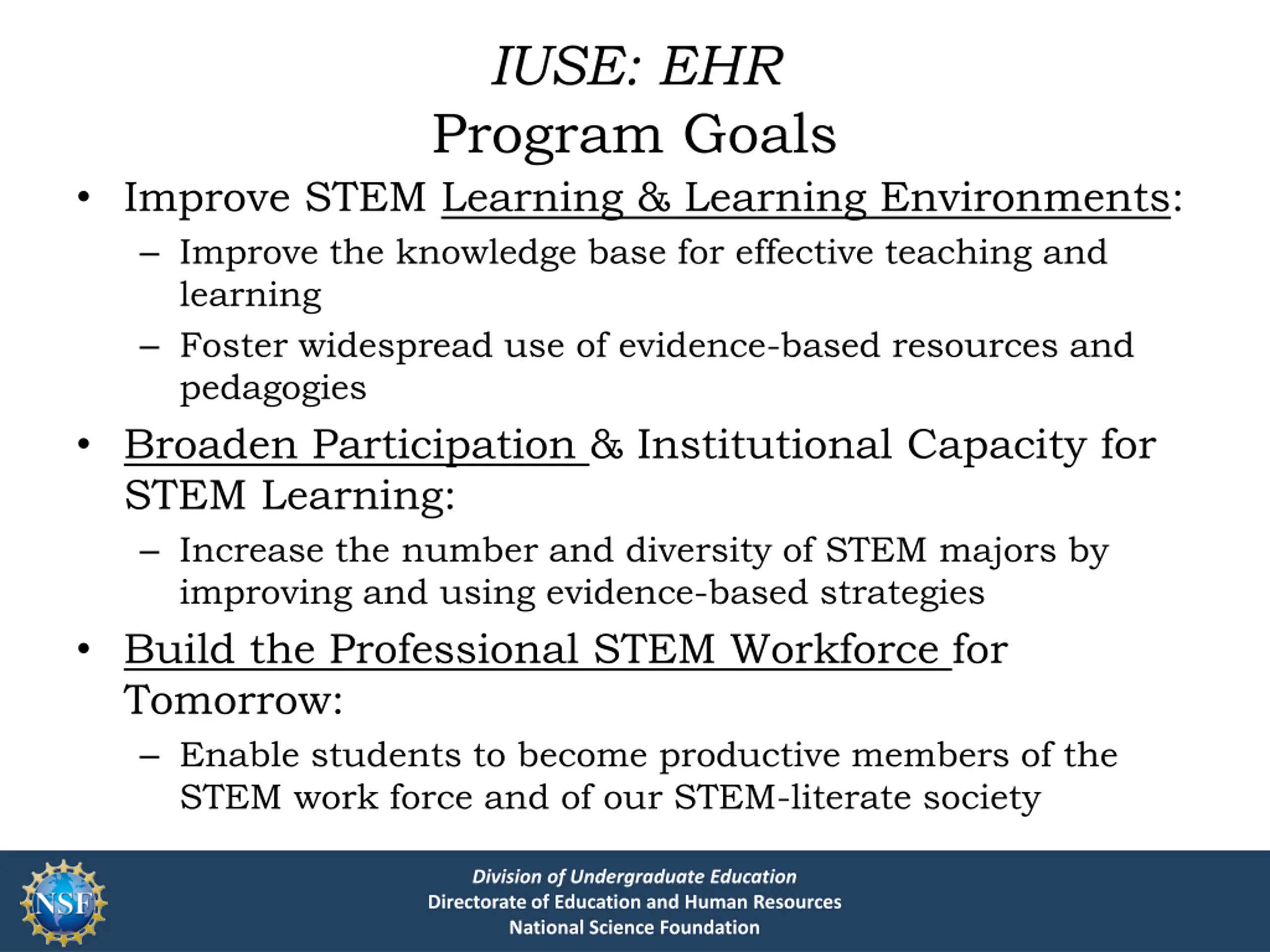 IUSE: EHR Program Goals Improve STEM Learning & Learning Environments: Improve the knowledge base for effective teaching and learning Foster widespread use of evidence-based resources and pedagogies Broaden Participation & Institutional Capacity for STEM Learning: Increase the number and diversity of STEM majors by improving and using evidence-based strategies Build the Professional STEM Workforce for Tomorrow: Enable students to become productive members of the STEM work force and of our STEM-literate society Division of Undergraduate Education Directorate of Education and Human Resources National Science Foundation
