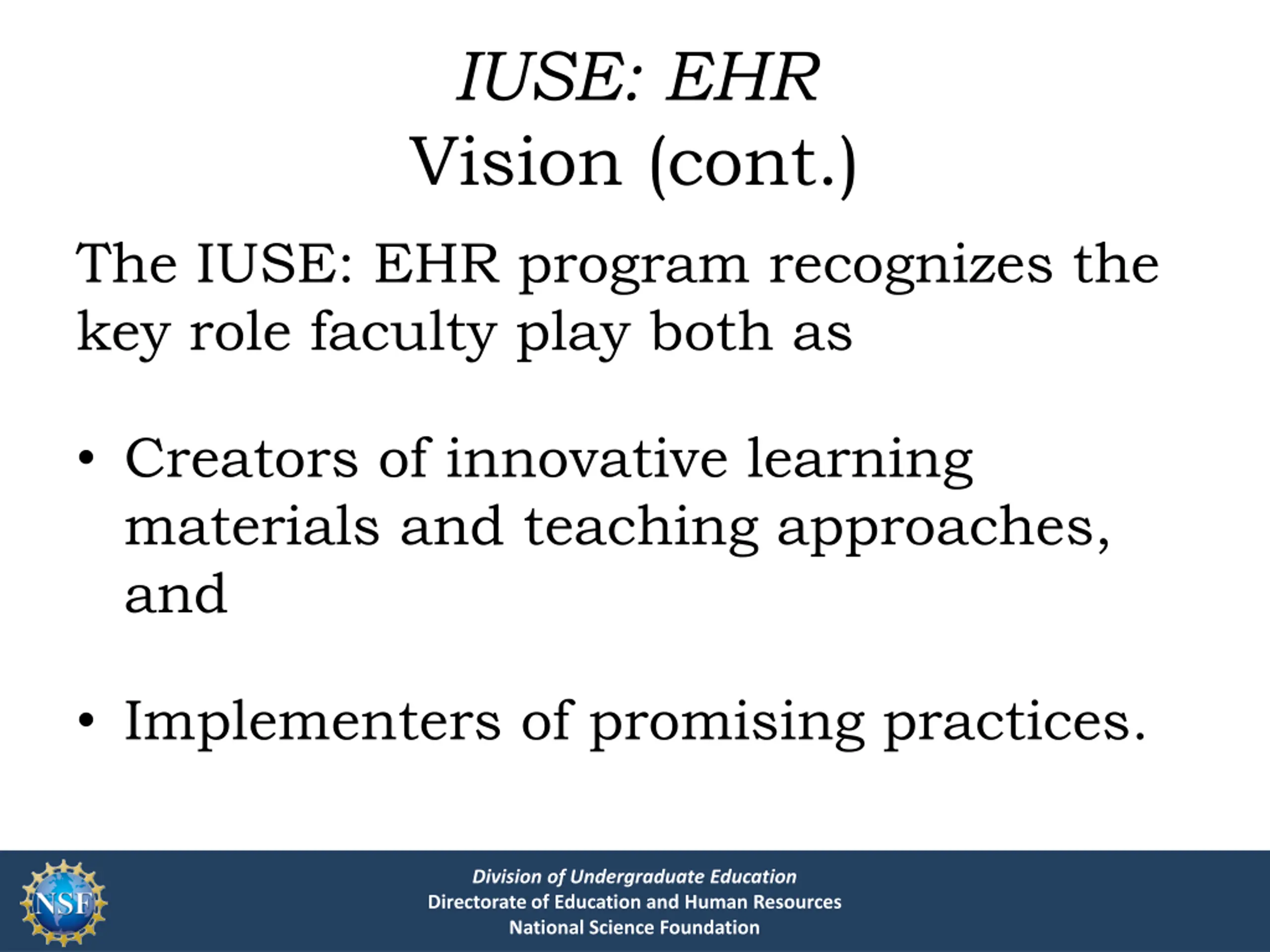 IUSE: EHR Vision (cont.) The IUSE: EHR program recognizes the key role faculty play both as Creators of innovative learning materials and teaching approaches, and Implementers of promising practices. Division of Undergraduate Education Directorate of Education and Human Resources National Science Foundation