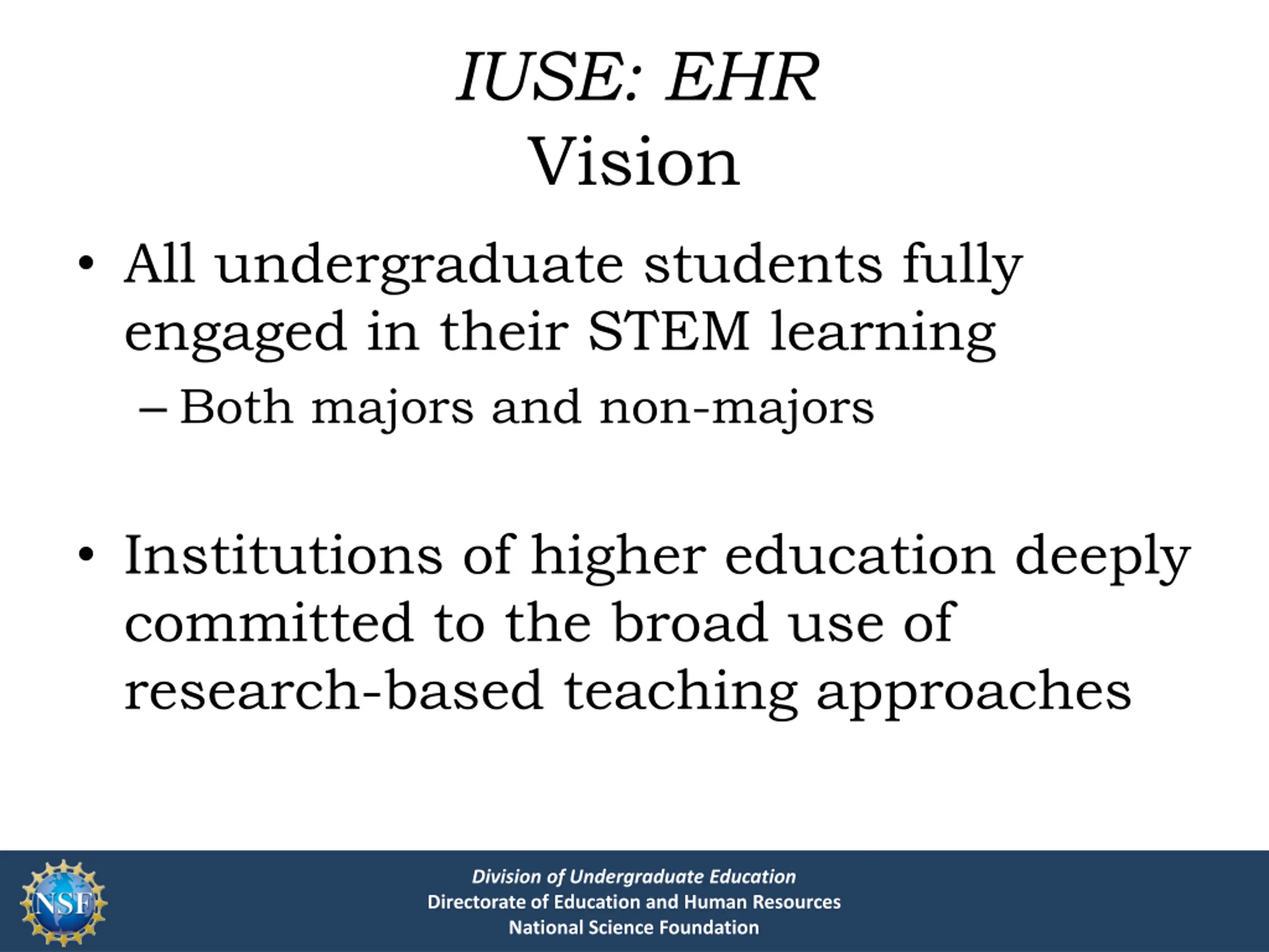 IUSE: EHR Vision All undergraduate students fully engaged in their STEM learning Both majors and non-majors Institutions of higher education deeply committed to the broad use of research-based teaching approaches Division of Undergraduate Education Directorate of Education and Human Resources National Science Foundation