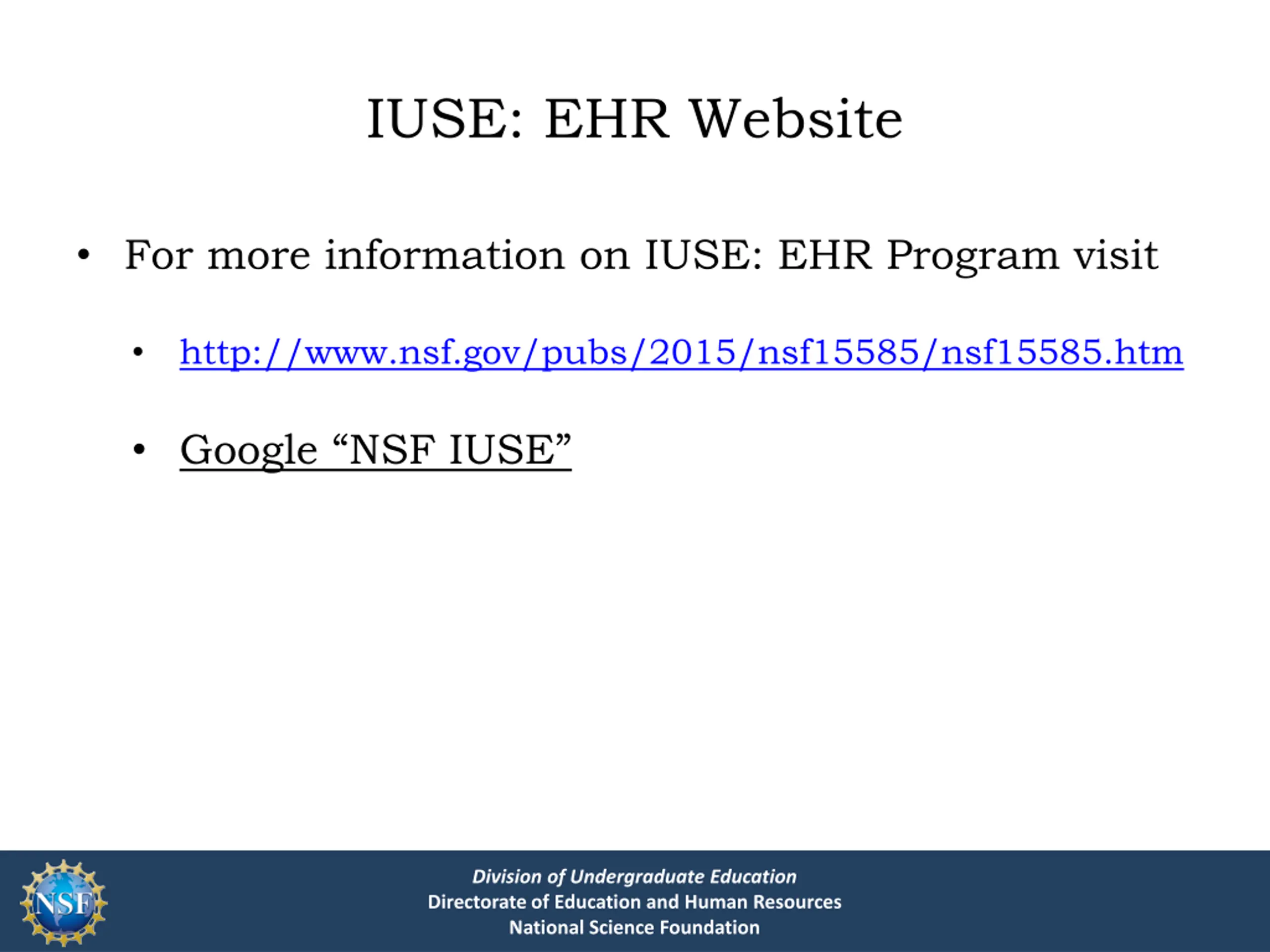 IUSE: EHR Website For more information on IUSE: EHR Program visit http://www.nsf.gov/pubs/2015/nsf15585/nsf15585.htm Google NSF IUSE Division of Undergraduate Education Directorate of Education and Human Resources National Science Foundation