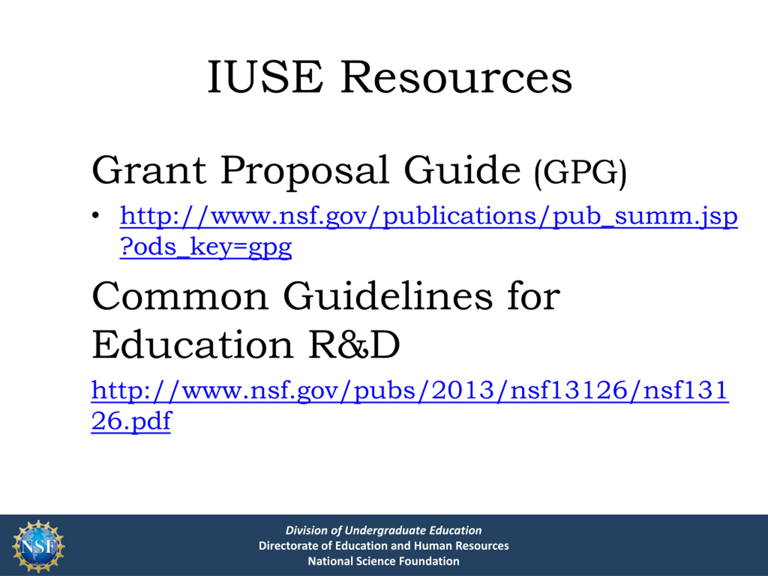 IUSE Resources Grant Proposal Guide (GPG) http://www.nsf.gov/publications/pub_summ.jsp ?ods_key=gpg Common Guidelines for Education R&D http://www.nsf.gov/pubs/2013/nsf13126/nsf131 26.pdf Division of Undergraduate Education Directorate of Education and Human Resources National Science Foundation