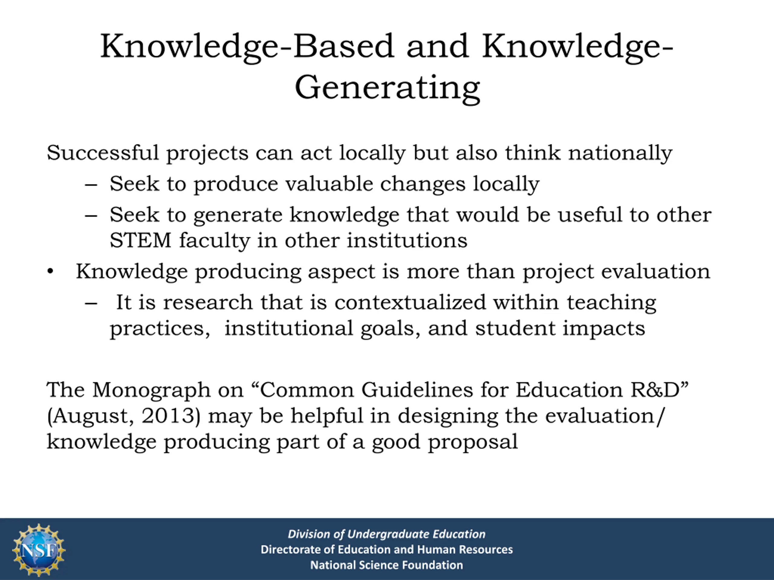Knowledge-Based and Knowledge- Generating Successful projects can act locally but also think nationally Seek to produce valuable changes locally Seek to generate knowledge that would be useful to other STEM faculty in other institutions Knowledge producing aspect is more than project evaluation It is research that is contextualized within teaching practices, institutional goals, and student impacts The Monograph on Common Guidelines for Education R&D (August, 2013) may be helpful in designing the evaluation/ knowledge producing part of a good proposal Division of Undergraduate Education Directorate of Education and Human Resources National Science Foundation