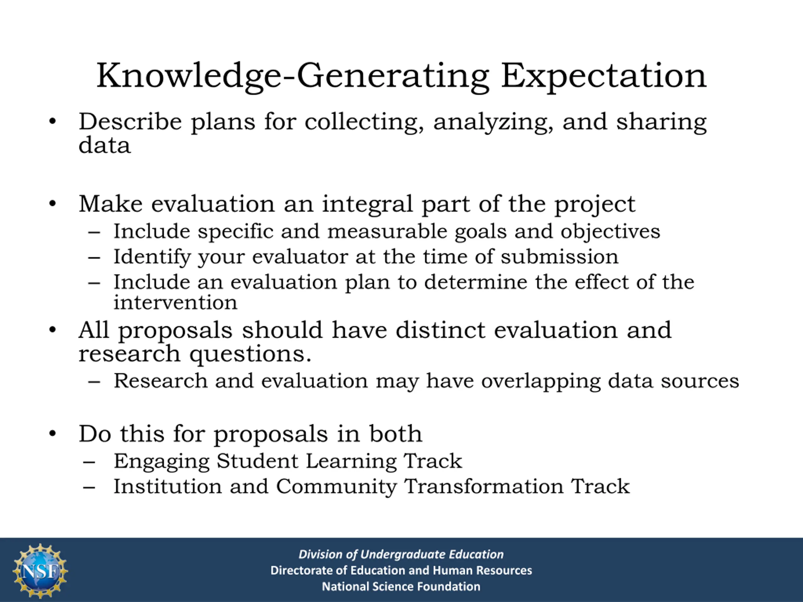 Knowledge-Generating Expectation Describe plans for collecting, analyzing, and sharing data Make evaluation an integral part of the project Include specific and measurable goals and objectives Identify your evaluator at the time of submission Include an evaluation plan to determine the effect of the intervention All proposals should have distinct evaluation and research questions. Research and evaluation may have overlapping data sources Do this for proposals in both Engaging Student Learning Track Institution and Community Transformation Track Division of Undergraduate Education Directorate of Education and Human Resources National Science Foundation