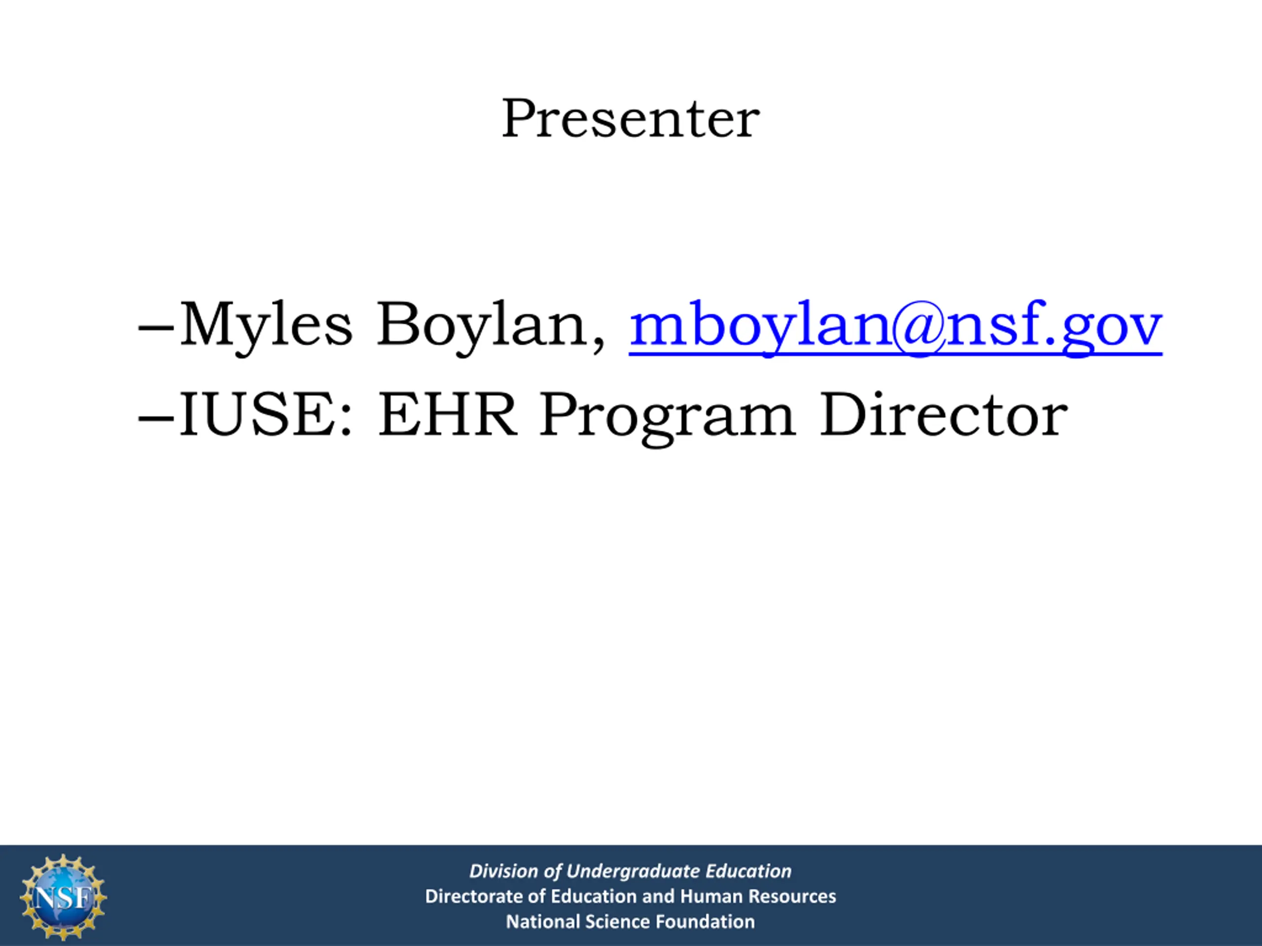 Presenter Myles Boylan, mboylan@nsf.gov IUSE: EHR Program Director Division of Undergraduate Education Directorate of Education and Human Resources National Science Foundation