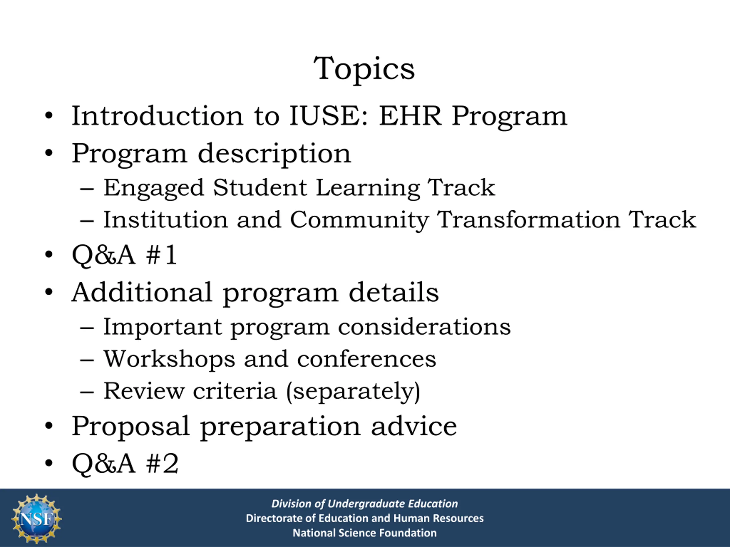 Topics Introduction to IUSE: EHR Program Program description Engaged Student Learning Track Institution and Community Transformation Track Q&A #1 Additional program details Important program considerations Workshops and conferences Review criteria (separately) Proposal preparation advice Q&A #2 Division of Undergraduate Education Directorate of Education and Human Resources National Science Foundation