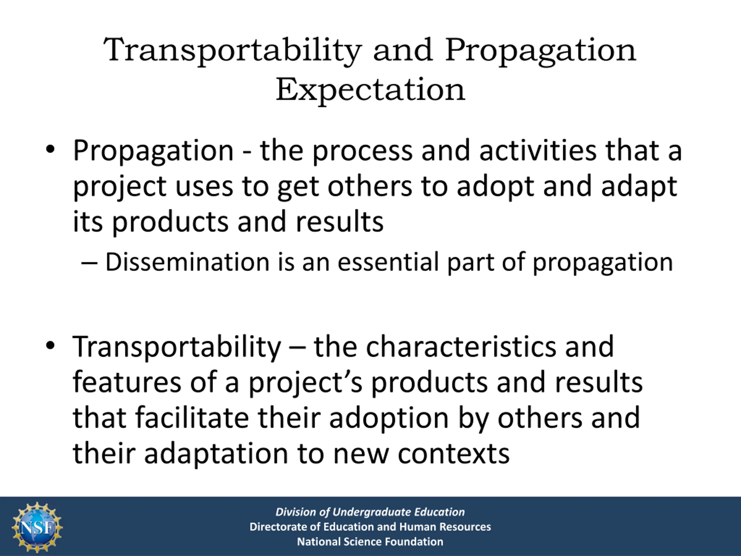 Transportability and Propagation Expectation Propagation - the process and activities that a project uses to get others to adopt and adapt its products and results Dissemination is an essential part of propagation Transportability the characteristics and features of a project s products and results that facilitate their adoption by others and their adaptation to new contexts Division of Undergraduate Education Directorate of Education and Human Resources National Science Foundation