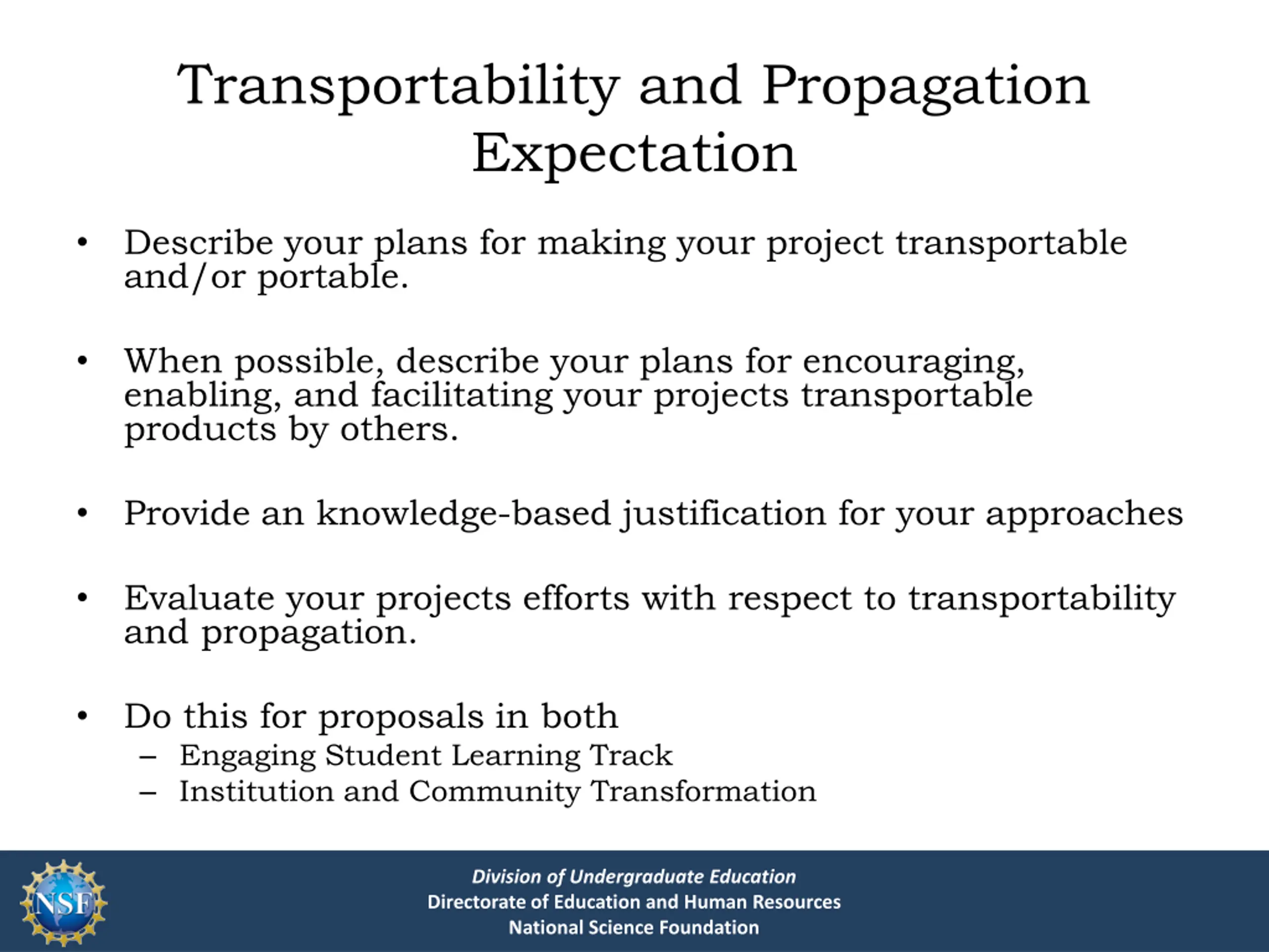 Transportability and Propagation Expectation Describe your plans for making your project transportable and/or portable. When possible, describe your plans for encouraging, enabling, and facilitating your projects transportable products by others. Provide an knowledge-based justification for your approaches Evaluate your projects efforts with respect to transportability and propagation. Do this for proposals in both Engaging Student Learning Track Institution and Community Transformation Division of Undergraduate Education Directorate of Education and Human Resources National Science Foundation