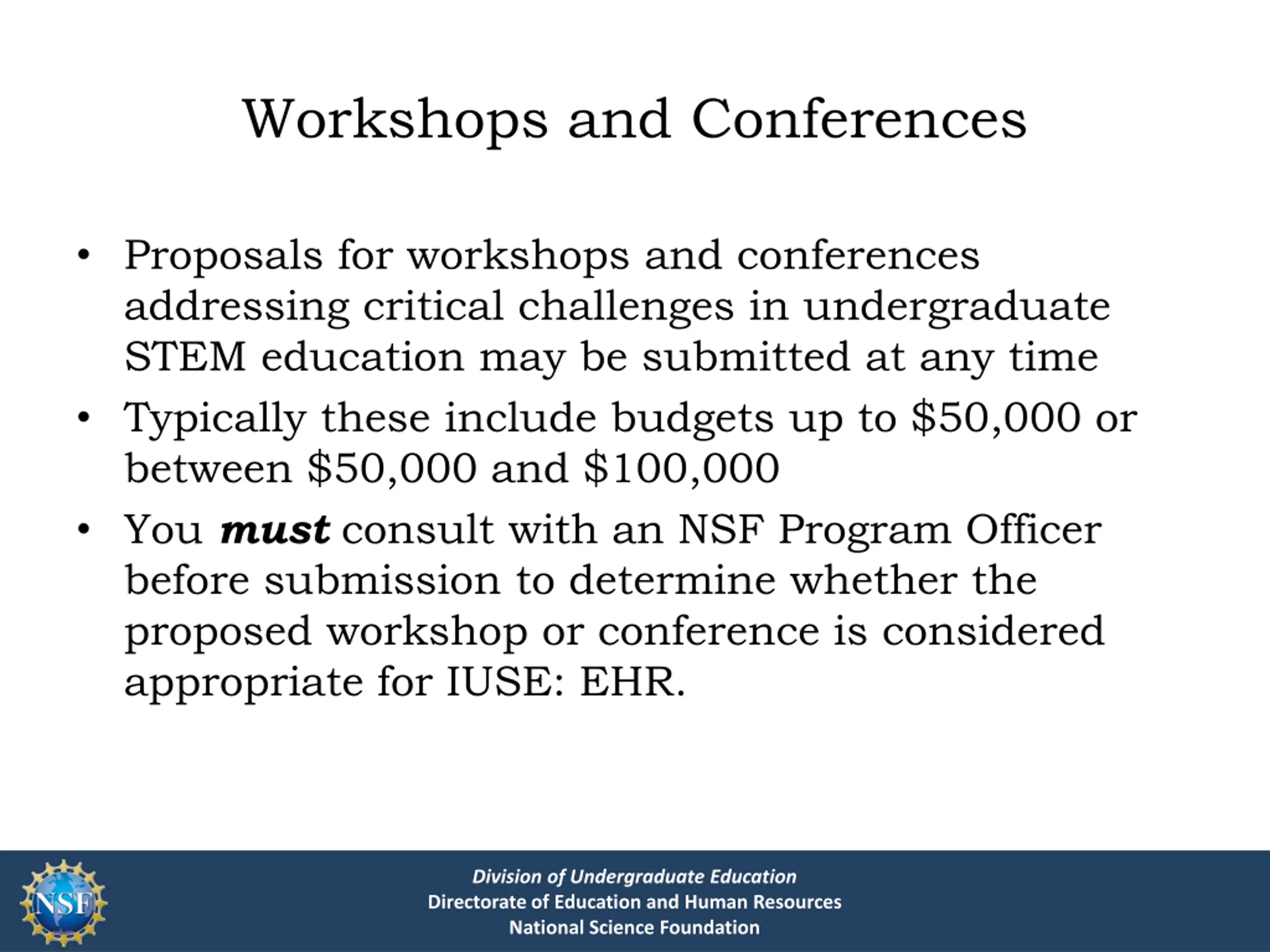 Workshops and Conferences Proposals for workshops and conferences addressing critical challenges in undergraduate STEM education may be submitted at any time Typically these include budgets up to $50,000 or between $50,000 and $100,000 You must consult with an NSF Program Officer before submission to determine whether the proposed workshop or conference is considered appropriate for IUSE: EHR. Division of Undergraduate Education Directorate of Education and Human Resources National Science Foundation