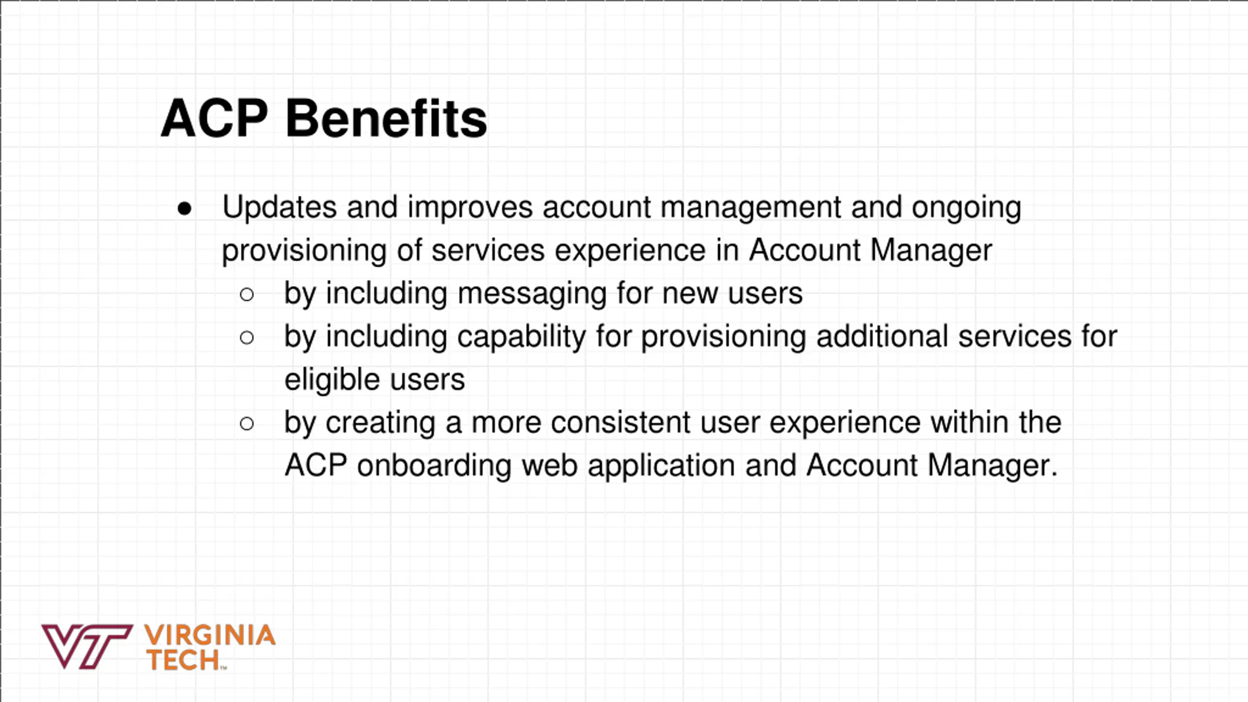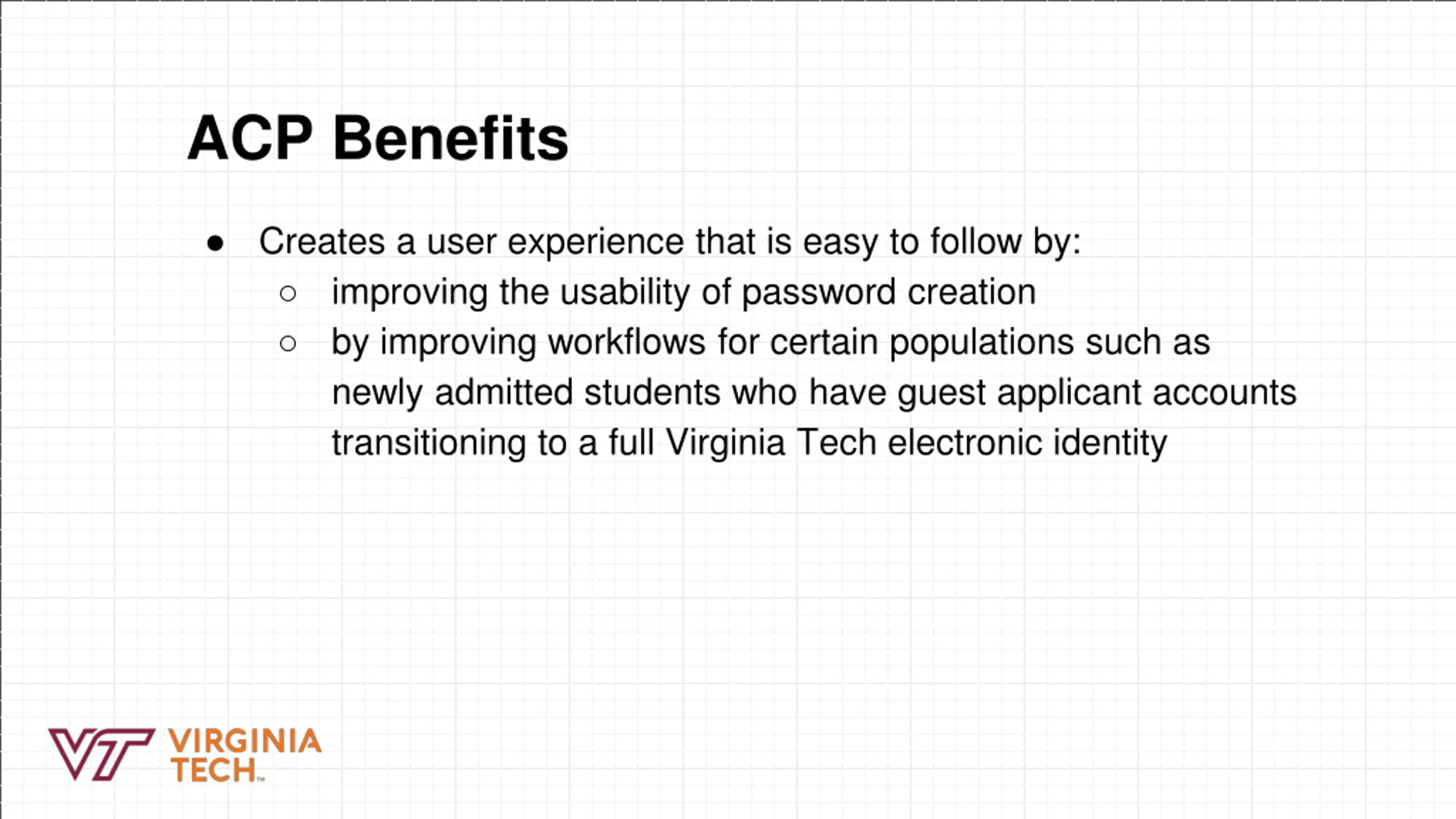 ACP Benefits Creates a user experience that is easy to follow by: improving the usability of password creation by improving workflows for certain populations such as newly admitted students who have guest applicant accounts transitioning to a full Virginia Tech electronic identity