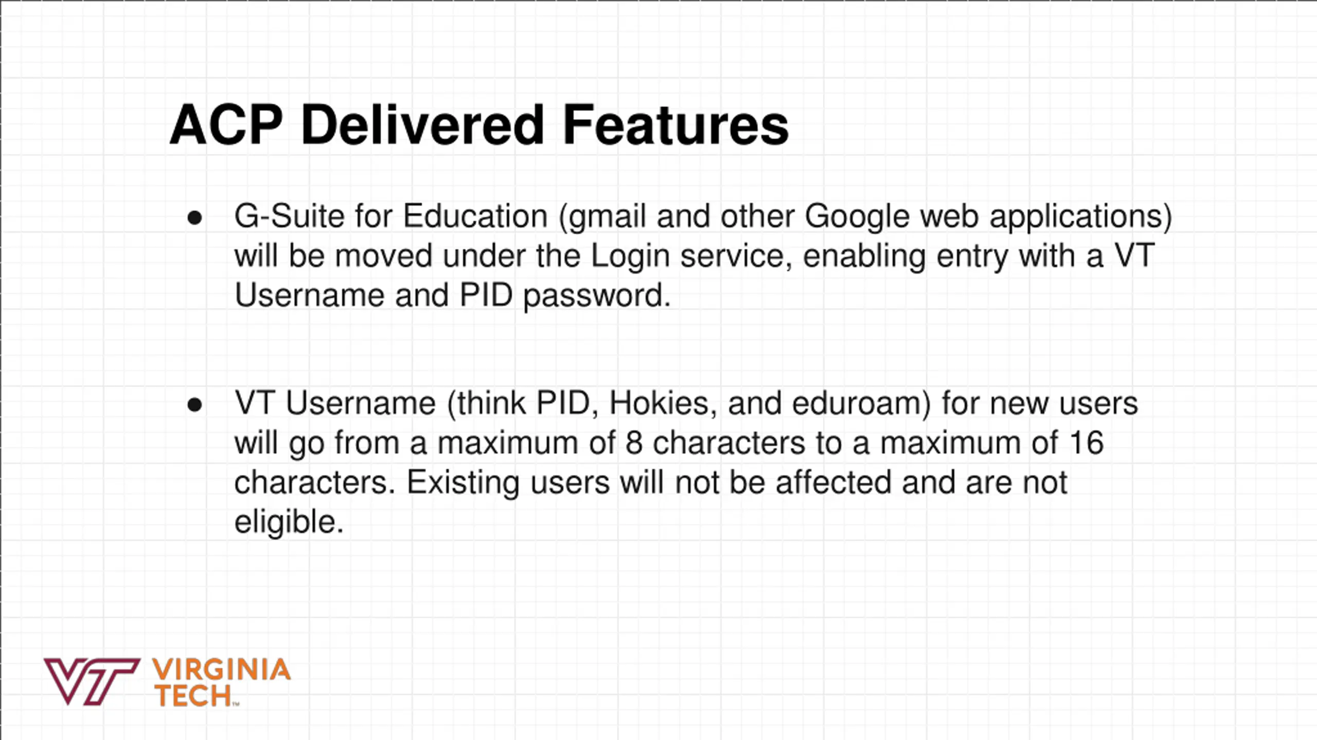 ACP Delivered Features G-Suite for Education (gmail and other Google web applications) will be moved under the Login service, enabling entry with a VT Username and PID password. VT Username (think PID, Hokies, and eduroam) for new users will go from a maximum of 8 characters to a maximum of 16 characters. Existing users will not be affected and are not eligible.