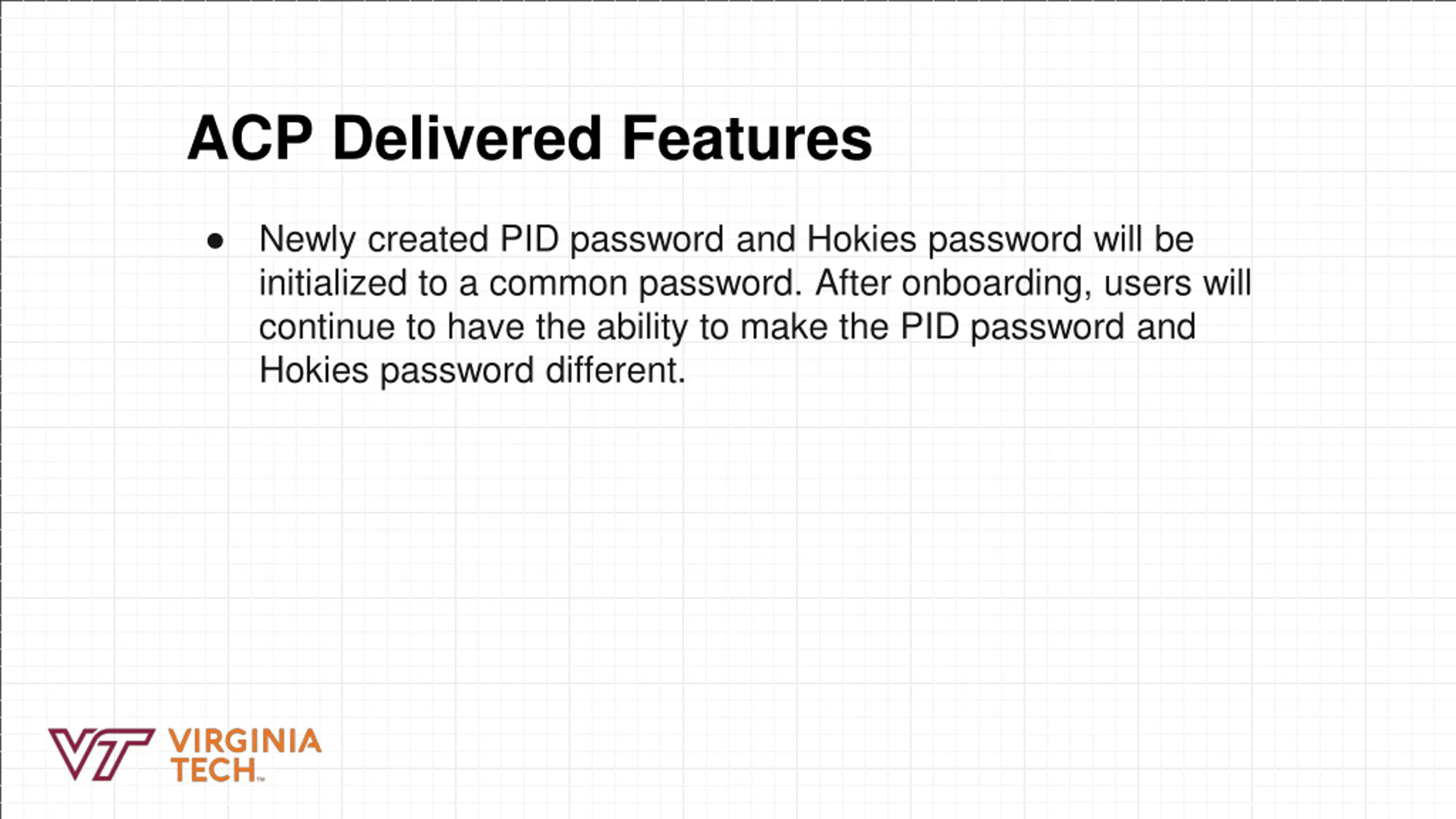 ACP Delivered Features Newly created PID password and Hokies password will be initialized to a common password. After onboarding, users will continue to have the ability to make the PID password and Hokies password different.
