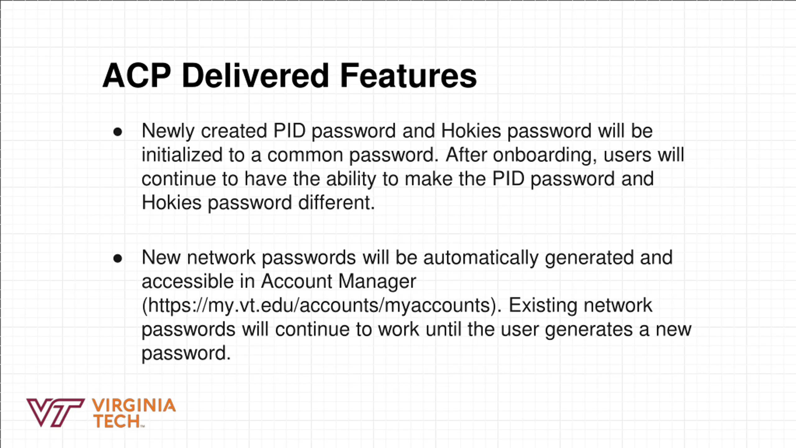 ACP Delivered Features Newly created PID password and Hokies password will be initialized to a common password. After onboarding, users will continue to have the ability to make the PID password and Hokies password different. New network passwords will be automatically generated and accessible in Account Manager (https://my.vt.edu/accounts/myaccounts). Existing network passwords will continue to work until the user generates a new password.