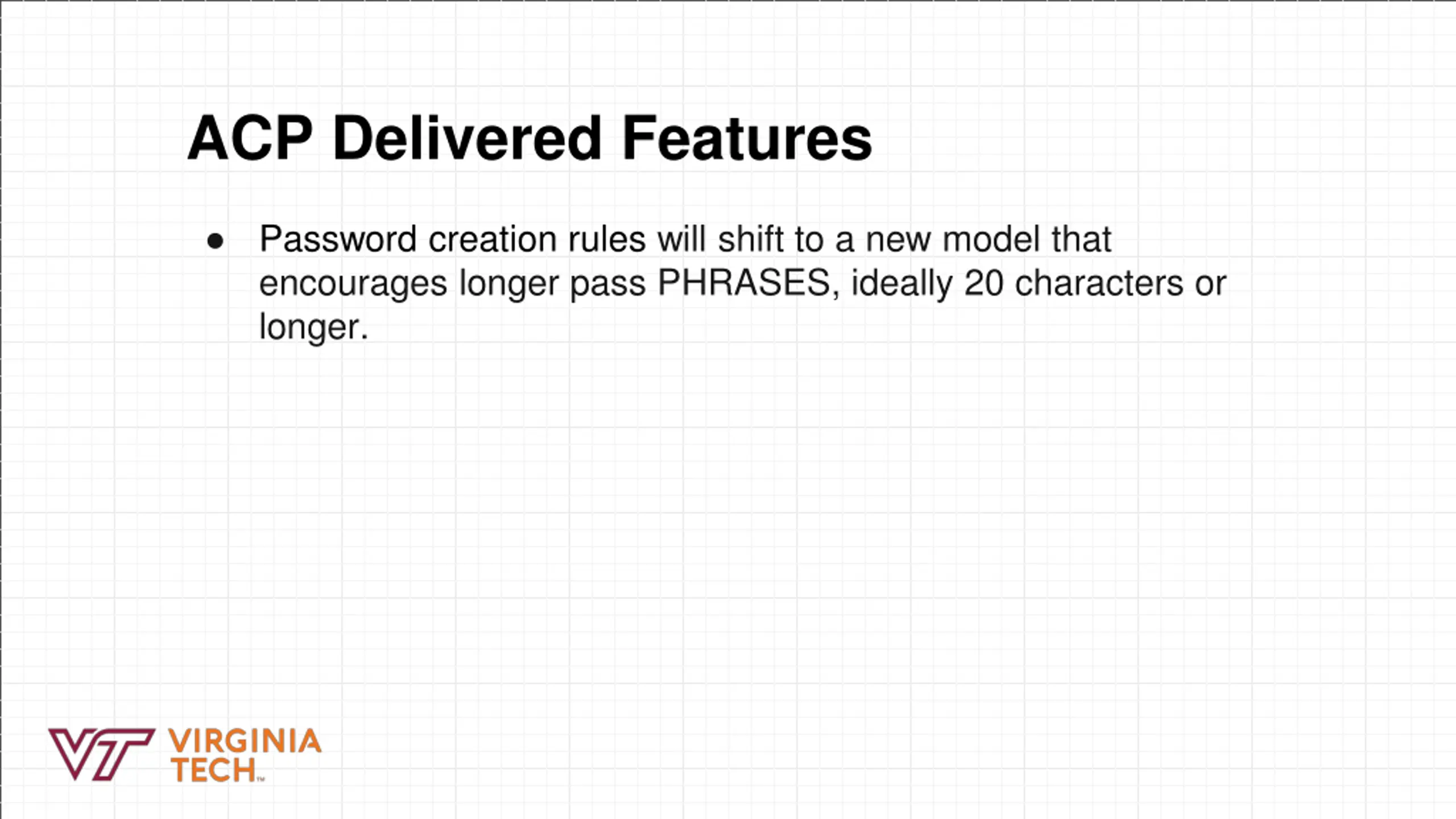 ACP Delivered Features Password creation rules will shift to a new model that encourages longer pass PHRASES, ideally 20 characters or longer.