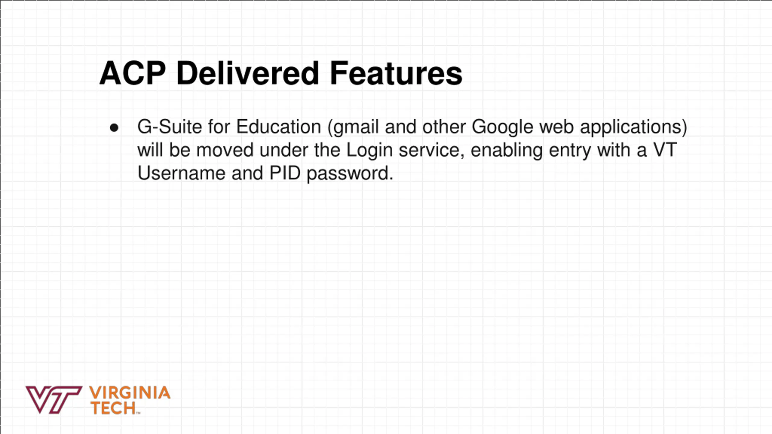 ACP Delivered Features G-Suite for Education (gmail and other Google web applications) will be moved under the Login service, enabling entry with a VT Username and PID password.