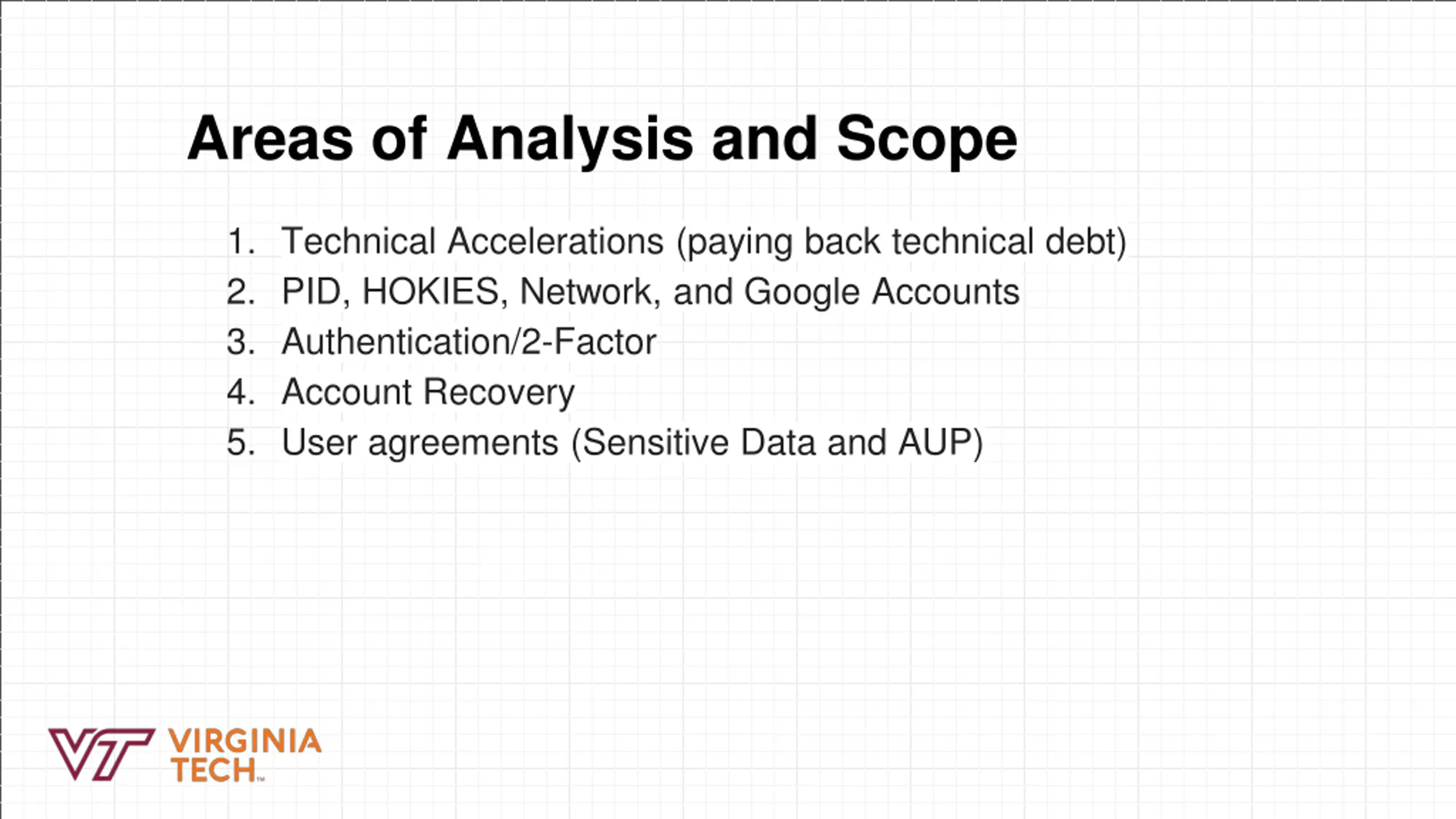 Areas of Analysis and Scope 1. Technical Accelerations (paying back technical debt) 2. PID, HOKIES, Network, and Google Accounts 3. Authentication/2-Factor 4. Account Recovery 5. User agreements (Sensitive Data and AUP)