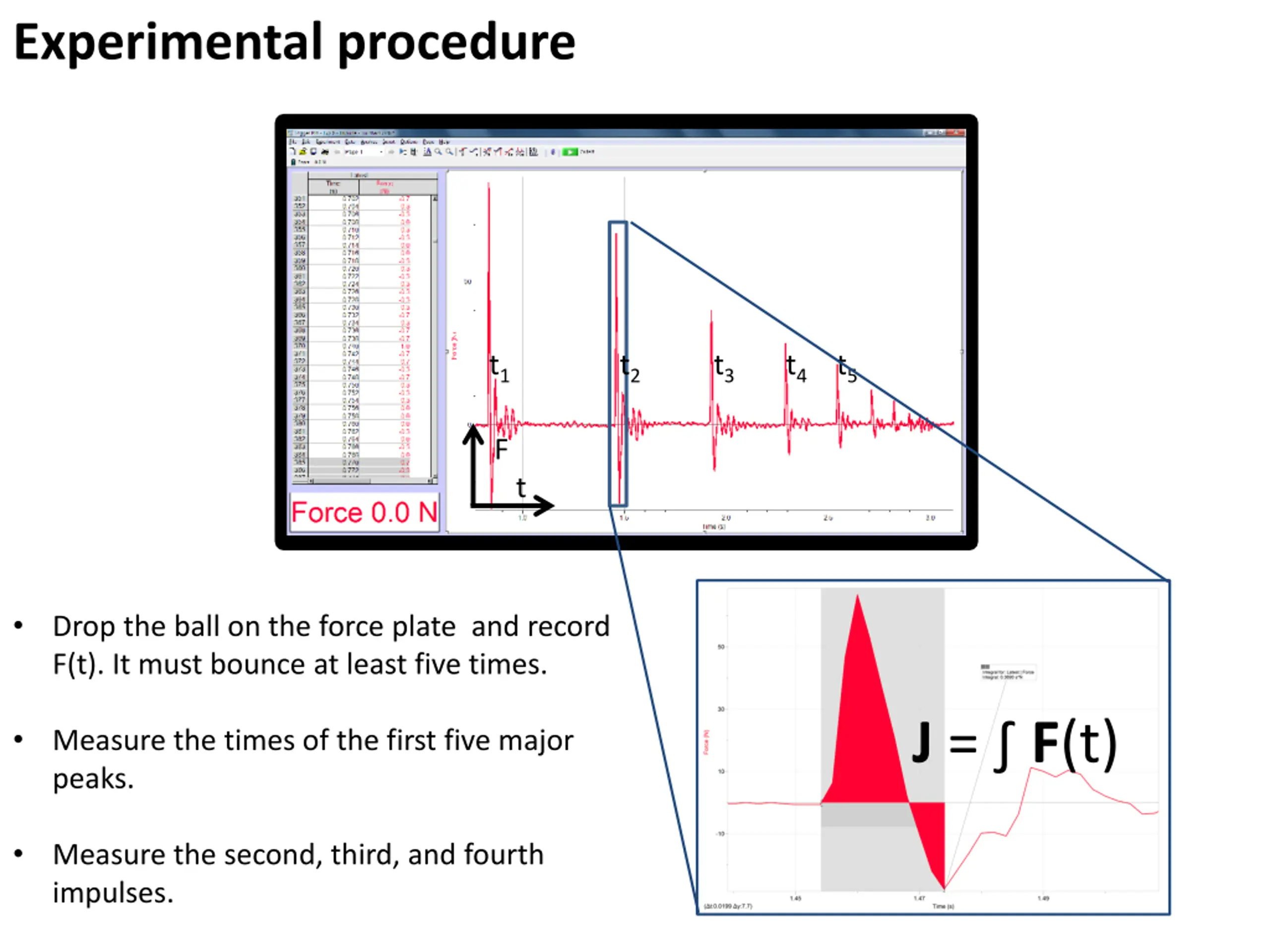Experimental procedure t1 t2 t3 t4 t5 F t Drop the ball on the force plate and record F(t). It must bounce at least five times. J= F(t) Measure the times of the first five major peaks. Measure the second, third, and fourth impulses.
