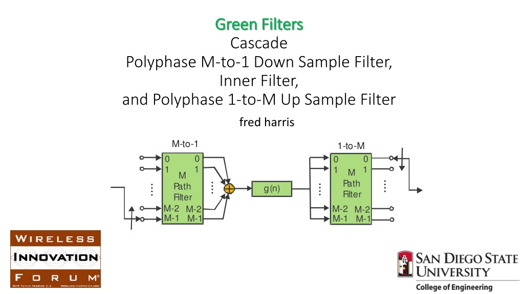 Green Filters Green Filters Cascade Polyphase M-to-1 Down Sample Filter, Inner Filter, and Polyphase 1-to-M Up Sample Filter fred harris M-to-1 1-to-M 0 1 0 1 0 1 0 1 M Path Filter M Path Filter .... .... .... .... g(n) M-2 M-2 M-2 M-2 M-1 M-1 M-1 M-1 SDSU College of Engineering