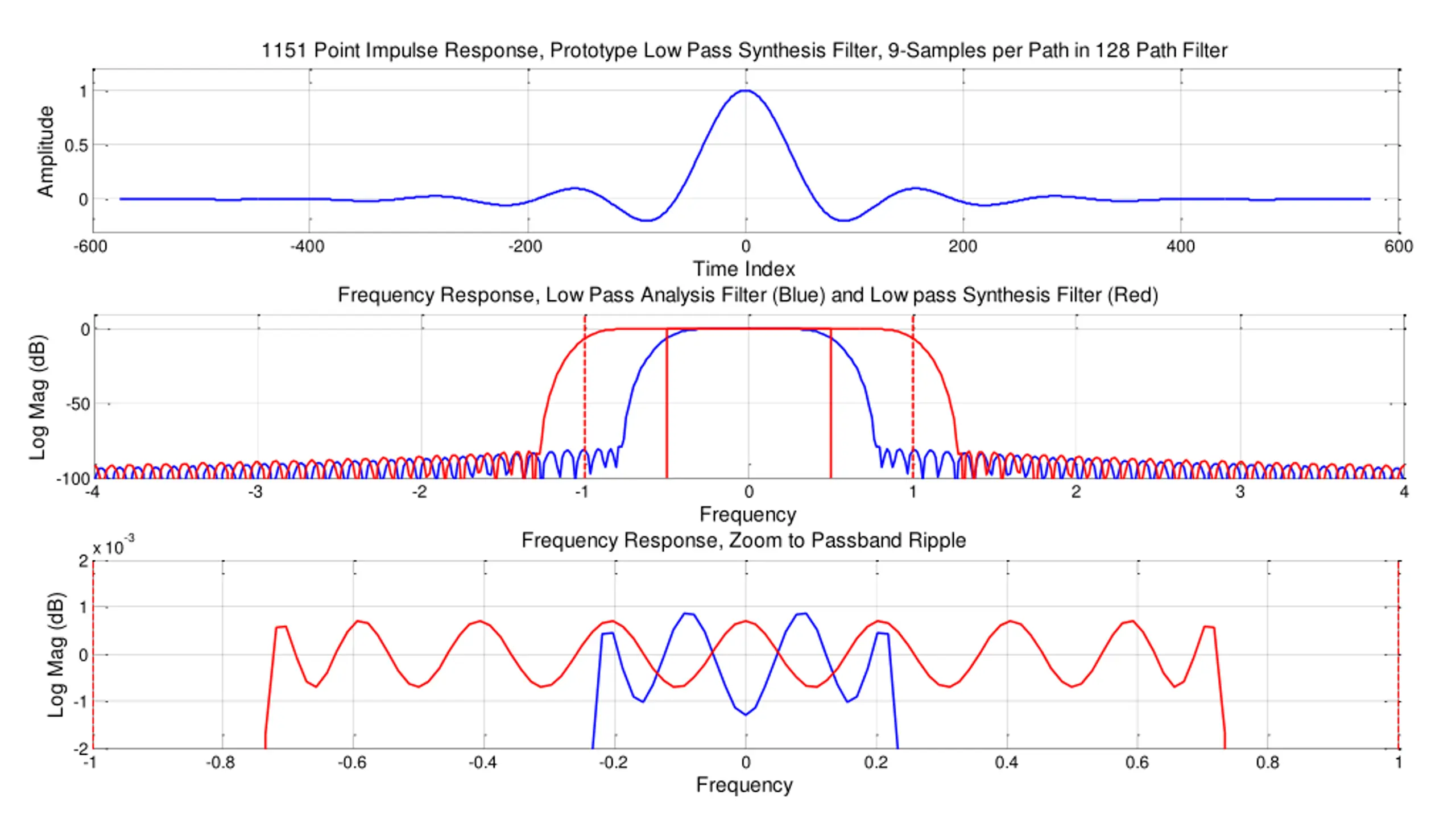 1151 Point Impulse Response, Prototype Low Pass Synthesis Filter, 9-Samples per Path in 128 Path Filter 1 Amplitude 0.5 0 -600 -400 -200 0 200 400 600 Time Index Frequency Response, Low Pass Analysis Filter (Blue) and Low pass Synthesis Filter (Red) 0 Log Mag (dB) -50 -100 -4 -3 -2 -1 0 1 2 3 4 Frequency Frequency Response, Zoom to Passband Ripple -3 2x 10 Log Mag (dB) 1 0 -1 -2 -1 -0.8 -0.6 -0.4 -0.2 0 0.2 0.4 0.6 0.8 1 Frequency