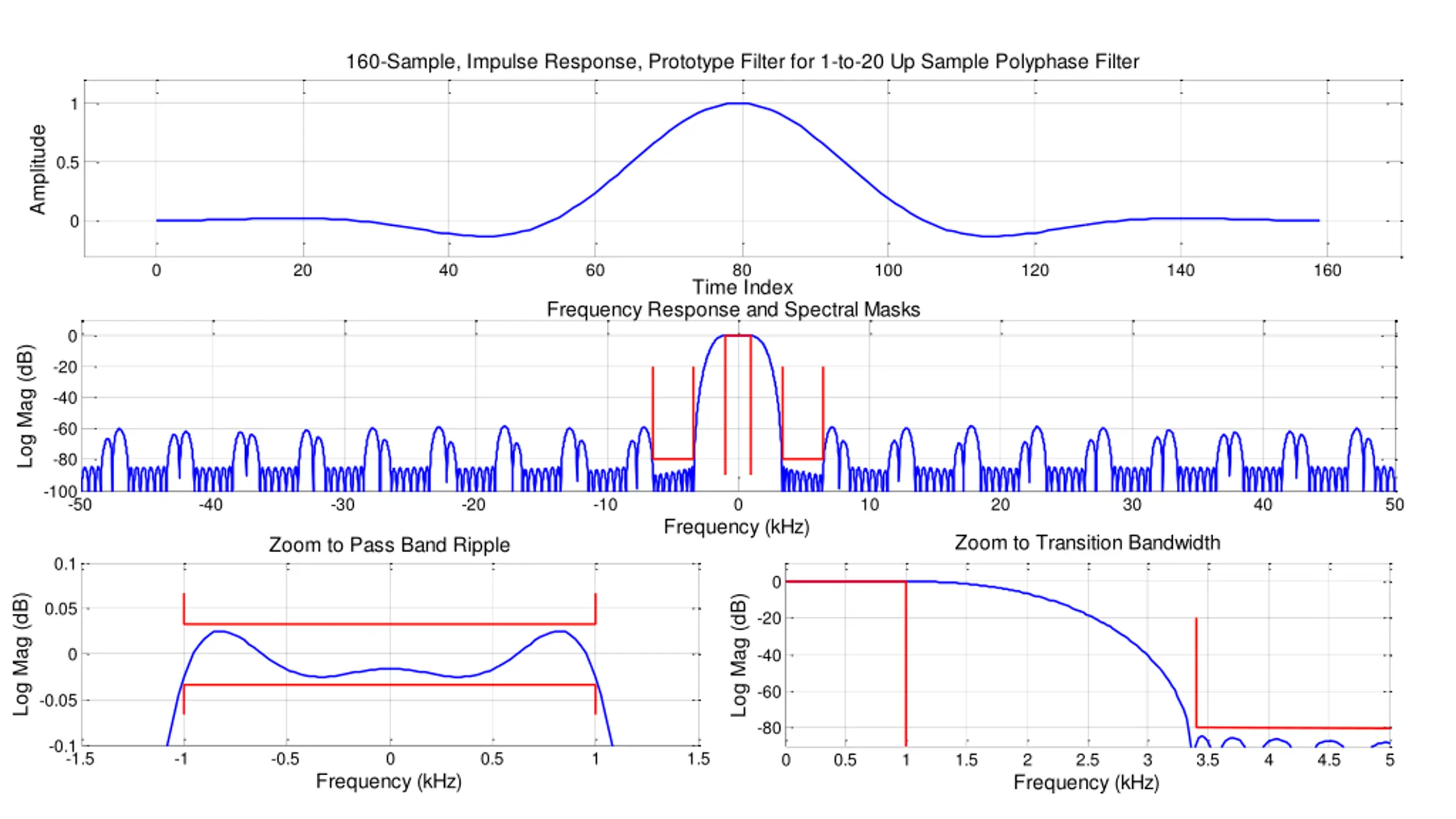 160-Sample, Impulse Response, Prototype Filter for 1-to-20 Up Sample Polyphase Filter 1 Amplitude 0.5 0 0 20 40 60 80 100 120 140 160 Time Index Frequency Response and Spectral Masks 0 Log Mag (dB) -20 -40 -60 -80 -100 -50 -40 -30 -20 -10 0 10 20 30 40 50 Frequency (kHz) Zoom to Transition Bandwidth Zoom to Pass Band Ripple 0.1 0 Log Mag (dB) Log Mag (dB) 0.05 -20 0 -40 -60 -0.05 -80 -0.1 -1.5 -1 -0.5 0 0.5 1 1.5 0 0.5 1 1.5 2 2.5 3 3.5 4 4.5 5 Frequency (kHz) Frequency (kHz)