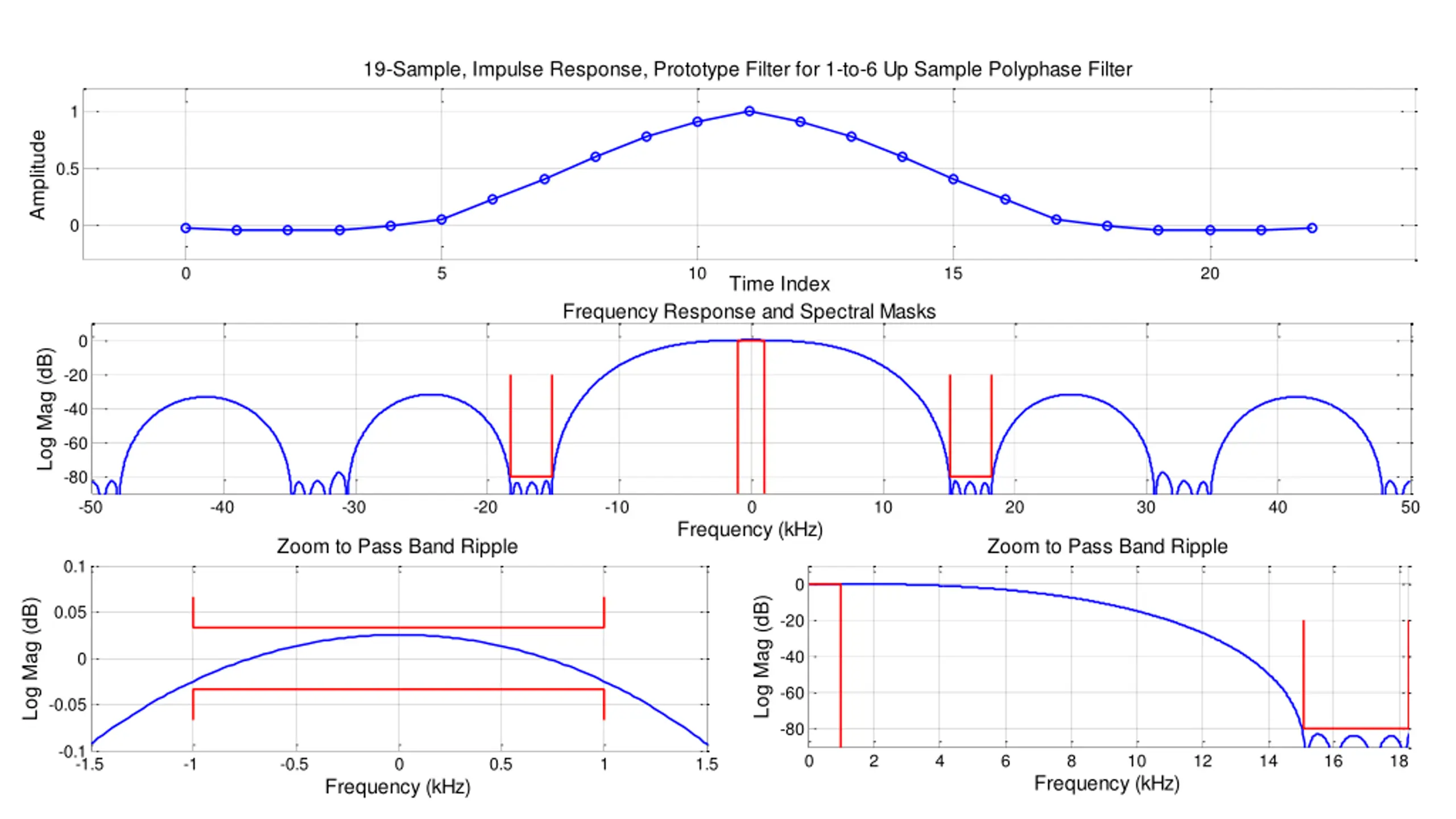 19-Sample, Impulse Response, Prototype Filter for 1-to-6 Up Sample Polyphase Filter 1 Amplitude 0.5 0 0 5 10 15 20 Time Index Frequency Response and Spectral Masks 0 Log Mag (dB) -20 -40 -60 -80 -50 -40 -30 -20 -10 0 10 20 30 40 50 Frequency (kHz) Zoom to Pass Band Ripple Zoom to Pass Band Ripple 0.1 0 Log Mag (dB) Log Mag (dB) 0.05 -20 -40 0 -60 -0.05 -80 -0.1 0 2 4 6 8 10 12 14 16 18 -1.5 -1 -0.5 0 0.5 1 1.5 Frequency (kHz) Frequency (kHz)