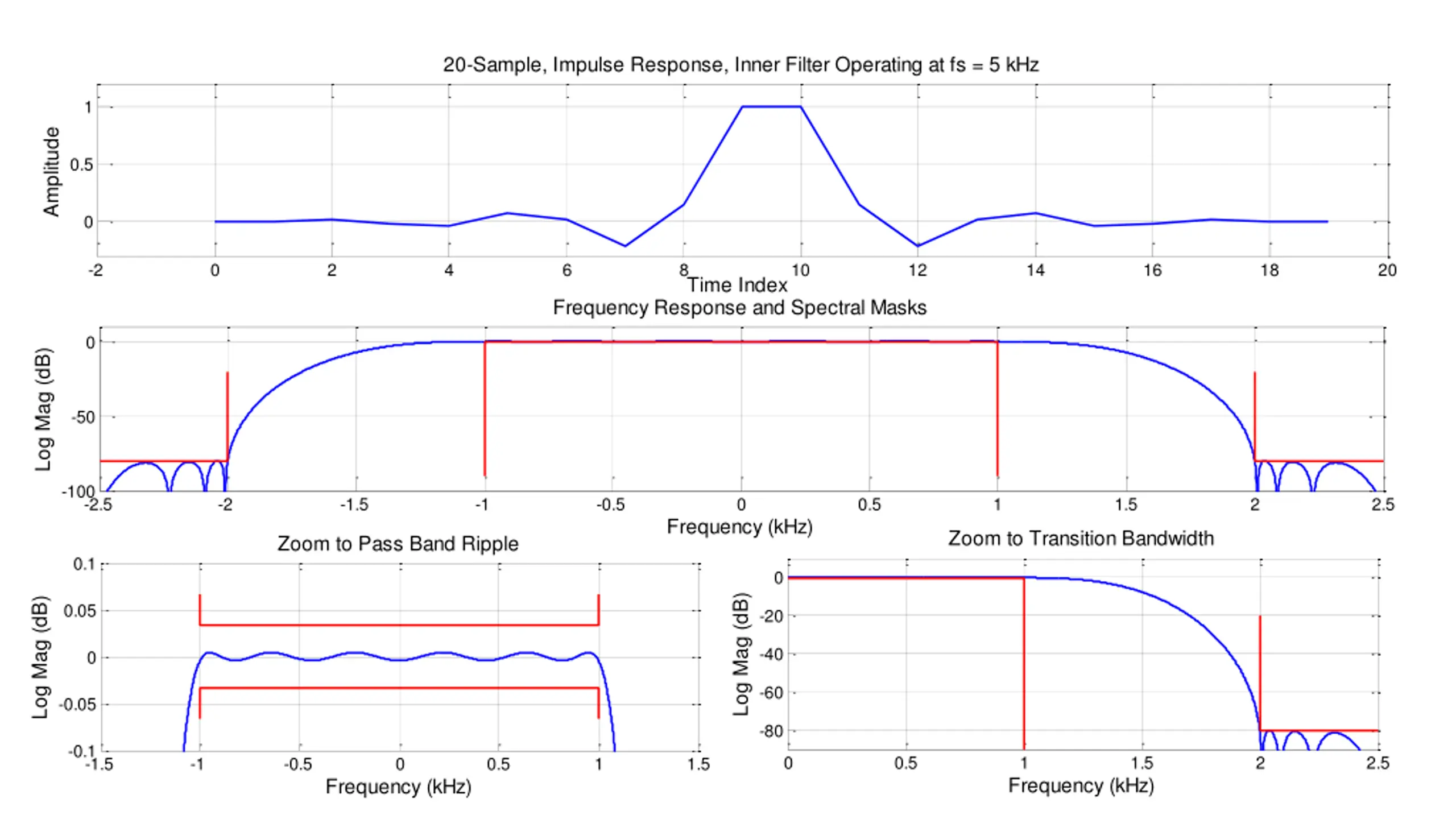 20-Sample, Impulse Response, Inner Filter Operating at fs = 5 kHz 1 Amplitude 0.5 0 -2 0 2 4 6 8 10 12 14 16 18 20 Time Index Frequency Response and Spectral Masks 0 Log Mag (dB) -50 -100 -2.5 -2 -1.5 -1 -0.5 0 0.5 1 1.5 2 2.5 Frequency (kHz) Zoom to Transition Bandwidth Zoom to Pass Band Ripple 0.1 0 Log Mag (dB) Log Mag (dB) 0.05 -20 -40 0 -60 -0.05 -80 -0.1 0 0.5 1 1.5 2 2.5 -1.5 -1 -0.5 0 0.5 1 1.5 Frequency (kHz) Frequency (kHz)