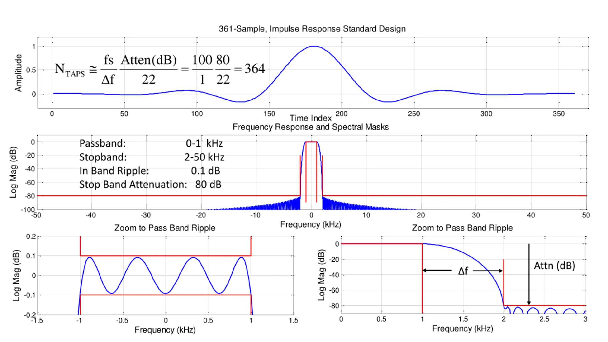 361-Sample, Impulse Response Standard Design 1 fs Atten(dB) f 100 80 1 22 Amplitude = = N 364 0.5 TAPS 22 0 0 50 100 150 200 250 300 350 Time Index Frequency Response and Spectral Masks 0 Passband: 0-1 kHz Stopband: 2-50 kHz In Band Ripple: 0.1 dB Stop Band Attenuation: 80 dB Log Mag (dB) -20 -40 -60 -80 -100 -50 -40 -30 -20 -10 0 10 20 30 40 50 Frequency (kHz) Zoom to Pass Band Ripple Zoom to Pass Band Ripple 0.2 0 Log Mag (dB) Log Mag (dB) 0.1 -20 Attn (dB) f -40 0 -60 -0.1 -80 -0.2 0 0.5 1 1.5 2 2.5 3 -1.5 -1 -0.5 0 0.5 1 1.5 Frequency (kHz) Frequency (kHz)