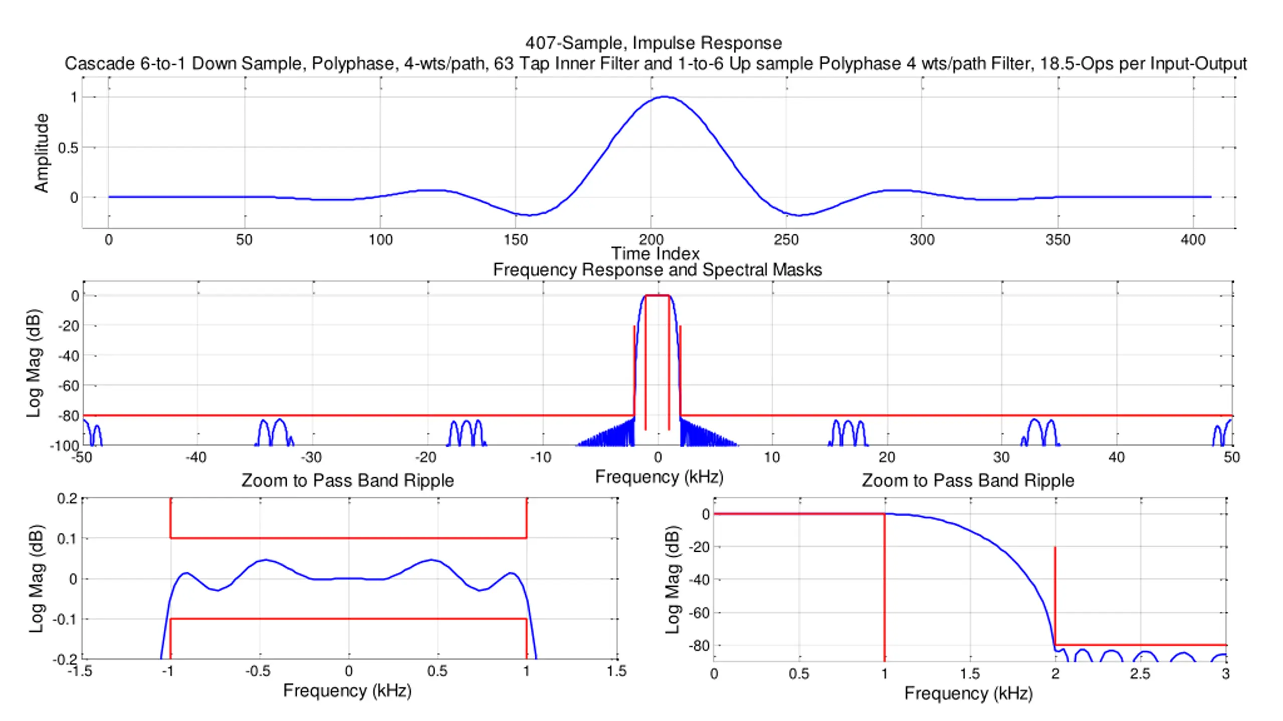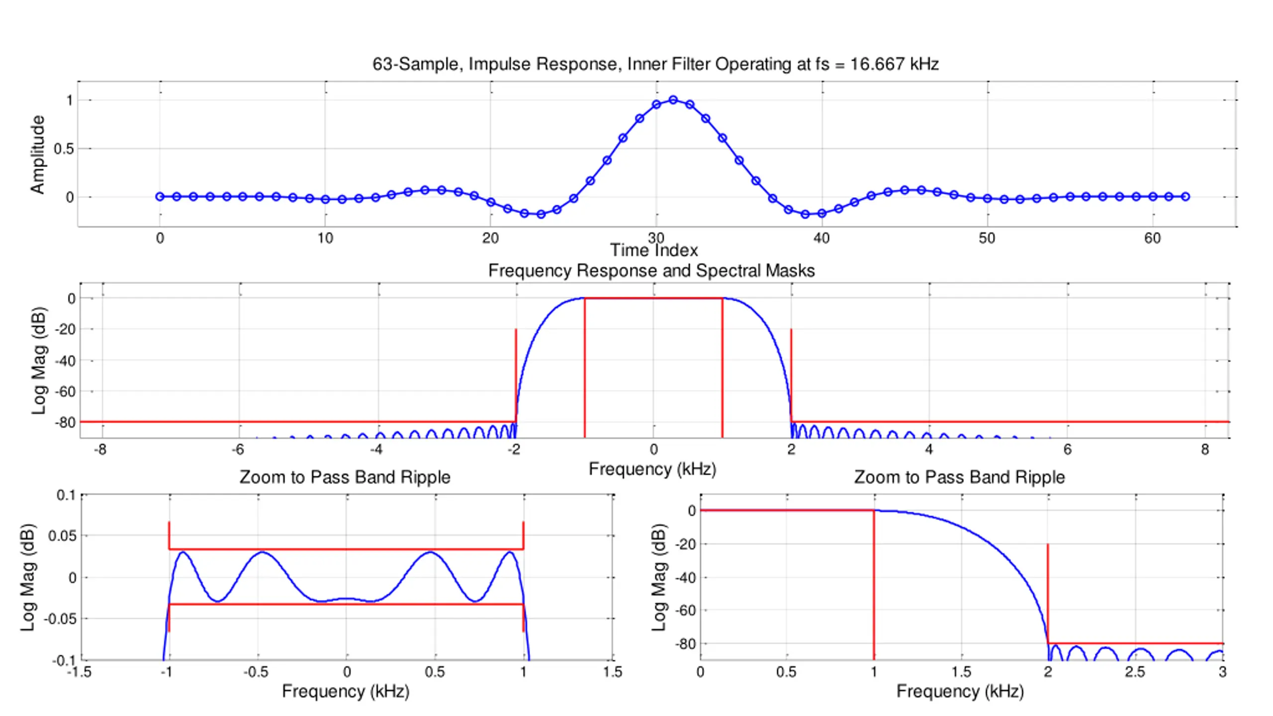 63-Sample, Impulse Response, Inner Filter Operating at fs = 16.667 kHz 1 Amplitude 0.5 0 0 10 20 30 40 50 60 Time Index Frequency Response and Spectral Masks 0 Log Mag (dB) -20 -40 -60 -80 -8 -6 -4 -2 0 2 4 6 8 Frequency (kHz) Zoom to Pass Band Ripple Zoom to Pass Band Ripple 0.1 0 Log Mag (dB) Log Mag (dB) 0.05 -20 0 -40 -60 -0.05 -80 -0.1 -1.5 -1 -0.5 0 0.5 1 1.5 0 0.5 1 1.5 2 2.5 3 Frequency (kHz) Frequency (kHz)