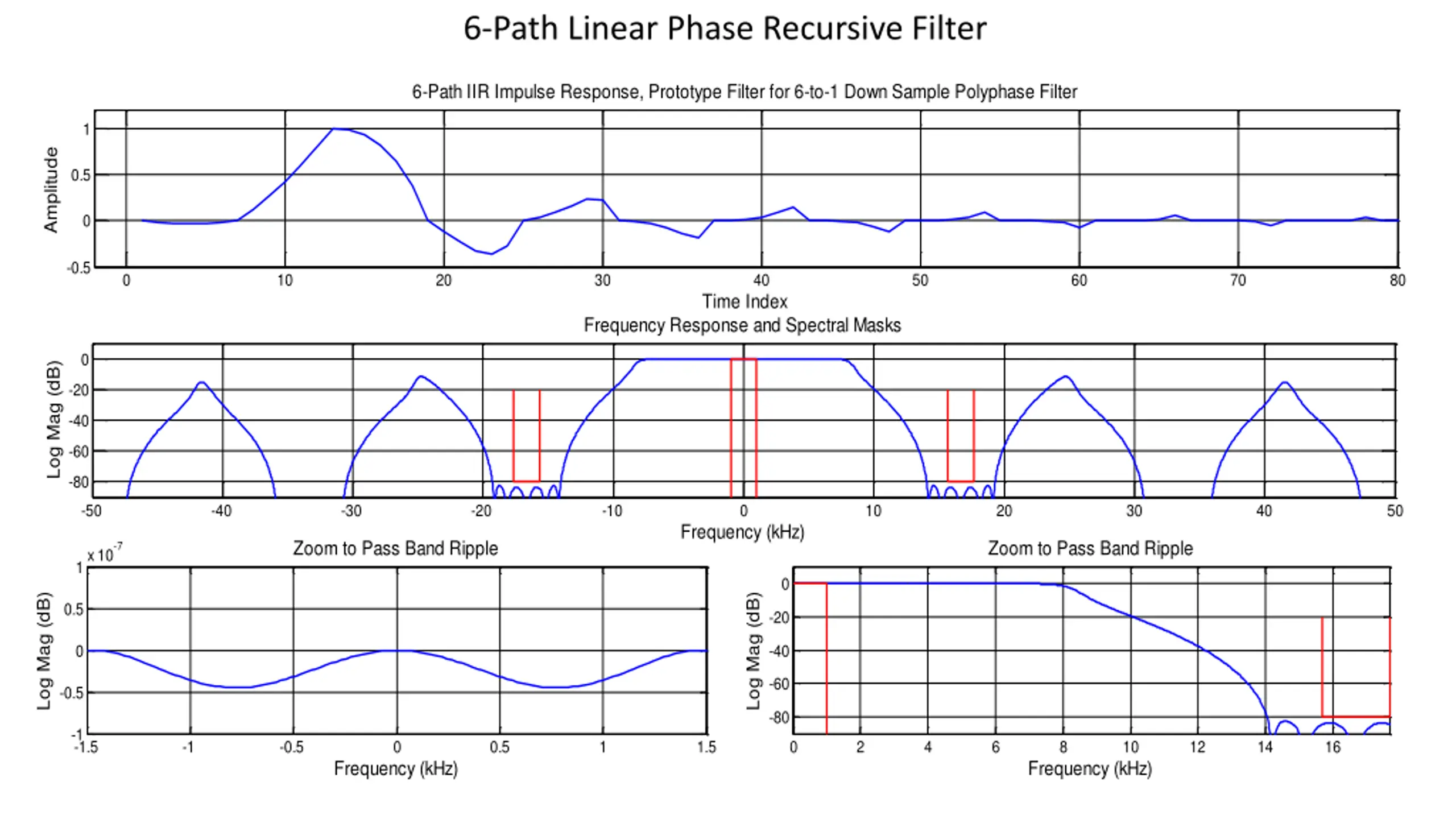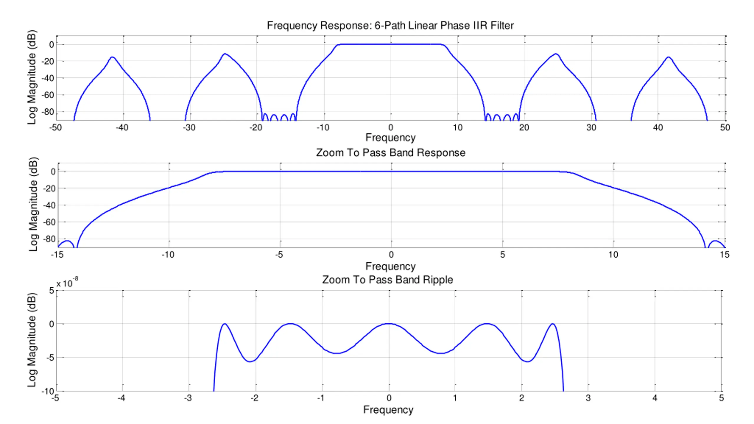Frequency Response: 6-Path Linear Phase IIR Filter Log Magnitude (dB) 0 -20 -40 -60 -80 -50 -40 -30 -20 -10 0 10 20 30 40 50 Frequency Zoom To Pass Band Response Log Magnitude (dB) 0 -20 -40 -60 -80 -15 -10 -5 0 5 10 15 Frequency Zoom To Pass Band Ripple -8 5x 10 Log Magnitude (dB) 0 -5 -10 -5 -4 -3 -2 -1 0 1 2 3 4 5 Frequency