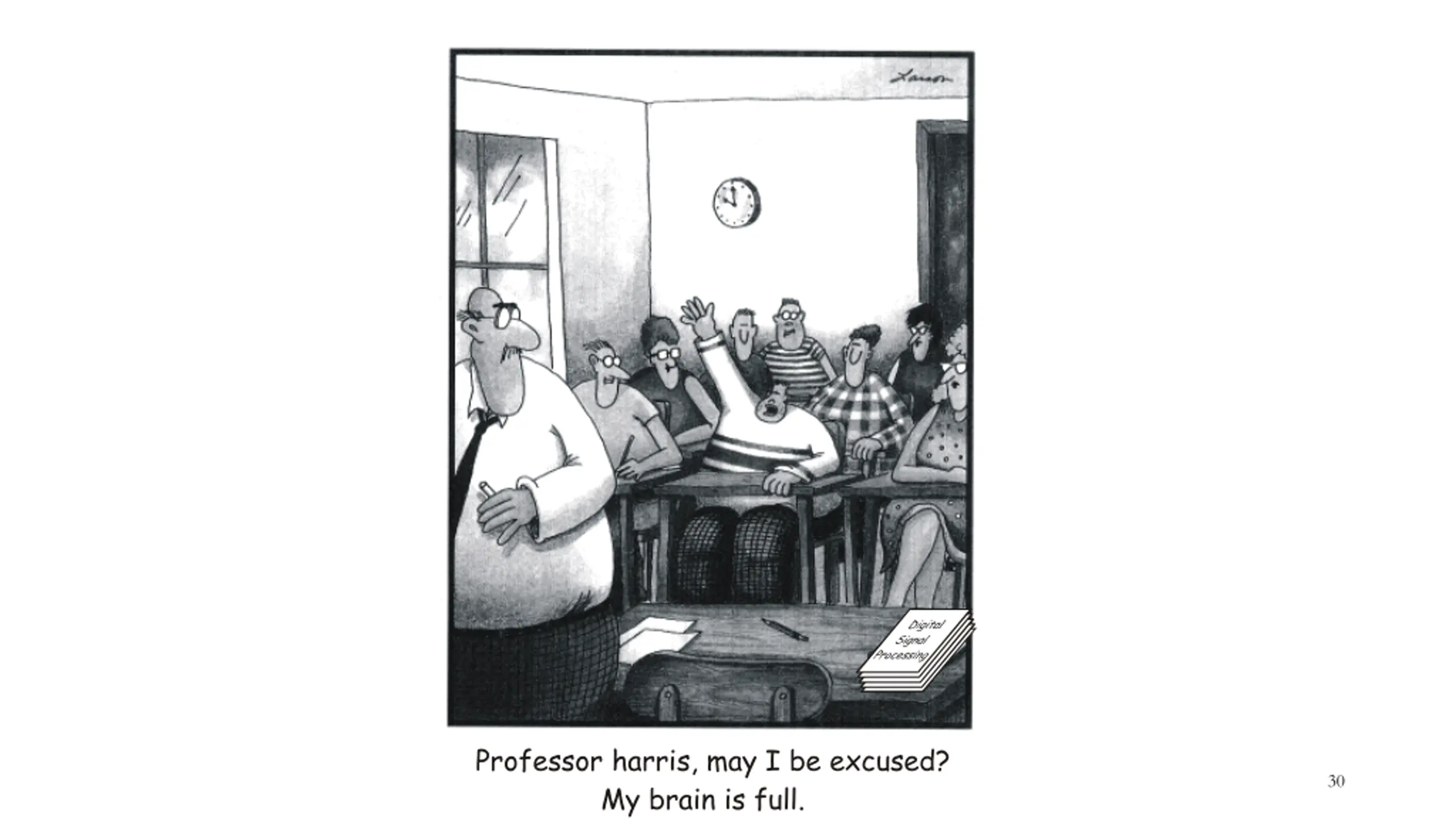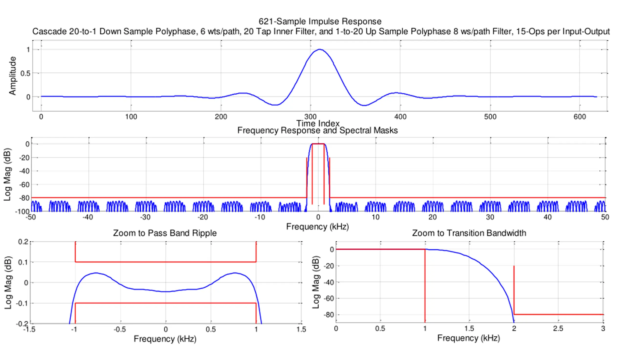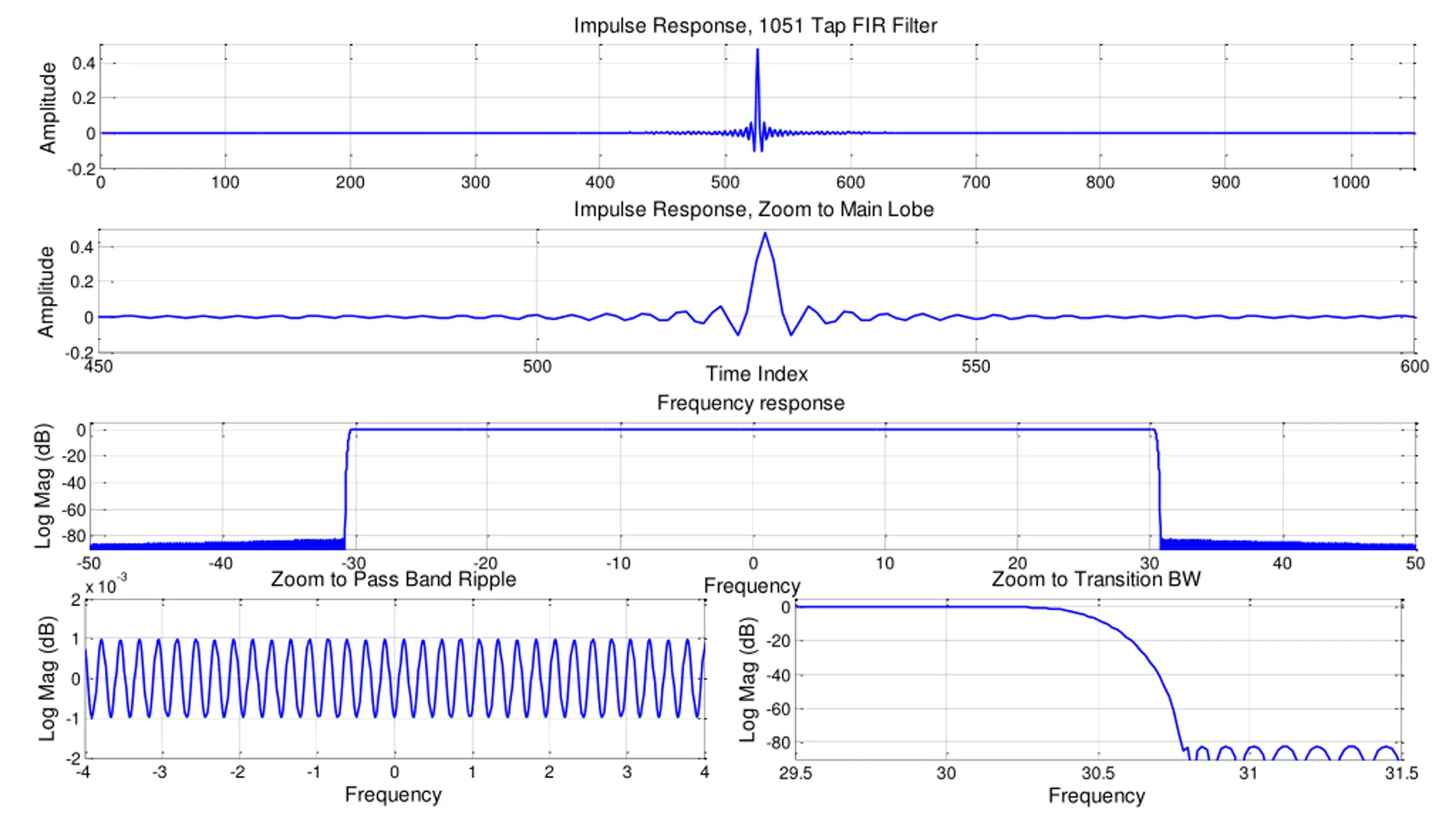 Impulse Response, 1051 Tap FIR Filter 0.4 Amplitude 0.2 0 -0.2 0 100 200 300 400 Impulse Response, Zoom to Main Lobe 500 600 700 800 900 1000 0.4 Amplitude 0.2 0 -0.2 450 500 550 600 Time Index Frequency response 0 Log Mag (dB) -20 -40 -60 -80 -50 2x 10 -40 -30 -20 -10 0 10 20 30 40 50 Zoom to Pass Band Ripple Zoom to Transition BW -3 Frequency 0 Log Mag (dB) Log Mag (dB) 1 -20 -40 0 -60 -1 -80 -2 -4 -3 -2 -1 0 1 2 3 4 29.5 30 30.5 31 31.5 Frequency Frequency