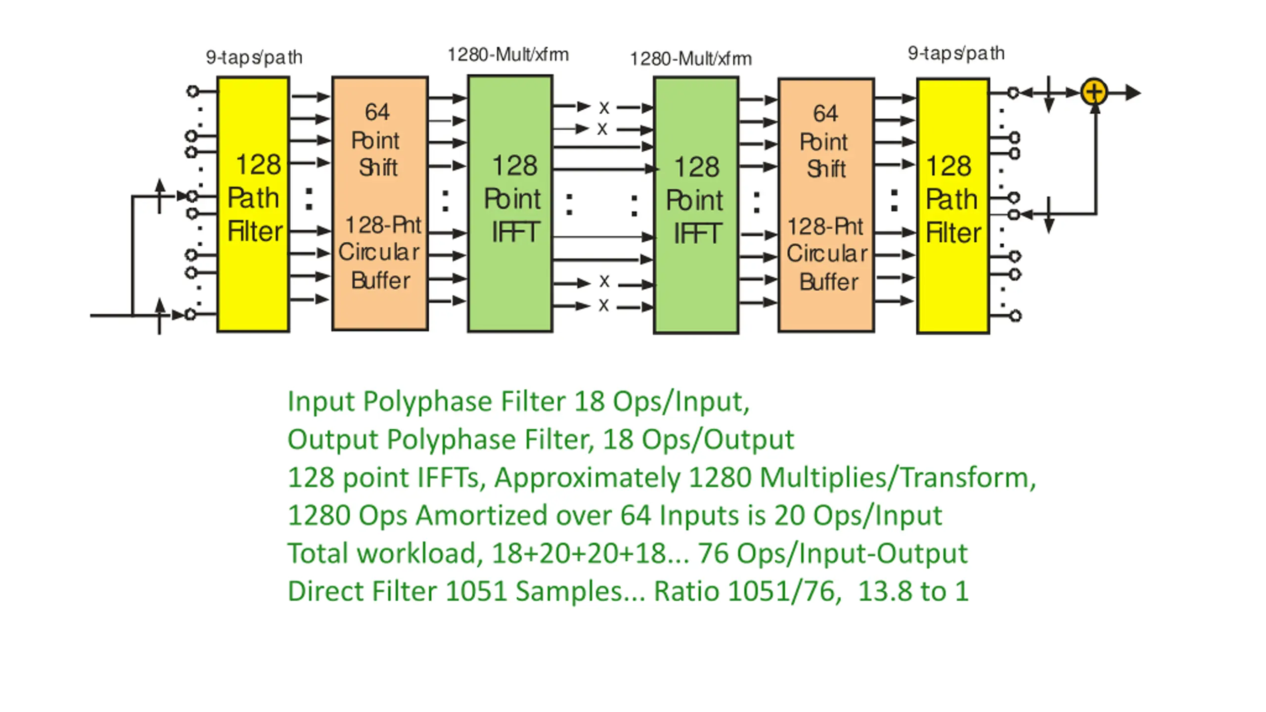 9-taps/path 1280-Mult/xfrm 9-taps/path 1280-Mult/xfrm x x 64 P oint S hift 128-P nt Circular Buffer 64 P oint S hift 128-P nt Circular Buffer .. .. 128 128 P oint IFFT 128 P ath Filter 128 P oint IFFT .. .. .. P ath Filter .. .. .. .. .. .. .. x x .. .. Input Polyphase Filter 18 Ops/Input, Output Polyphase Filter, 18 Ops/Output 128 point IFFTs, Approximately 1280 Multiplies/Transform, 1280 Ops Amortized over 64 Inputs is 20 Ops/Input Total workload, 18+20+20+18... 76 Ops/Input-Output Direct Filter 1051 Samples... Ratio 1051/76, 13.8 to 1