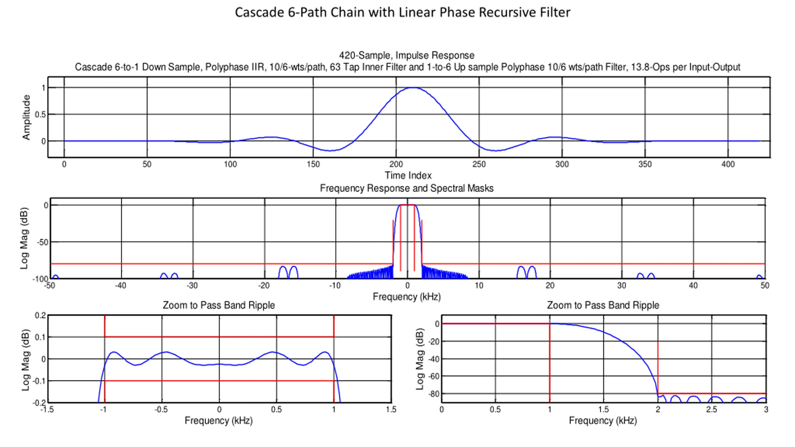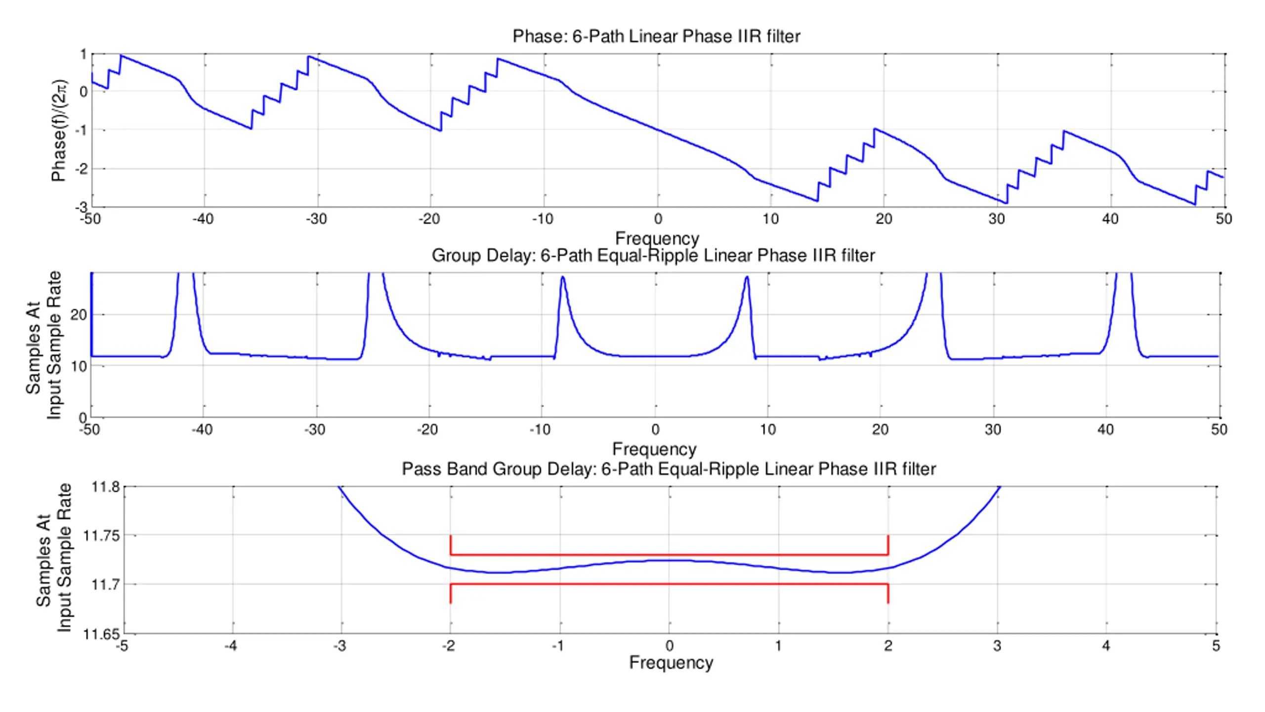 Phase: 6-Path Linear Phase IIR filter 1 Phase(f)/(2 ) 0 -1 -2 -3 -50 -40 -30 -20 -10 0 10 20 30 40 50 Frequency Group Delay: 6-Path Equal-Ripple Linear Phase IIR filter Input Sample Rate Samples At 20 10 0 -50 -40 -30 -20 -10 0 10 20 30 40 50 Frequency Pass Band Group Delay: 6-Path Equal-Ripple Linear Phase IIR filter 11.8 Input Sample Rate Samples At 11.75 11.7 11.65 -5 -4 -3 -2 -1 0 1 2 3 4 5 Frequency