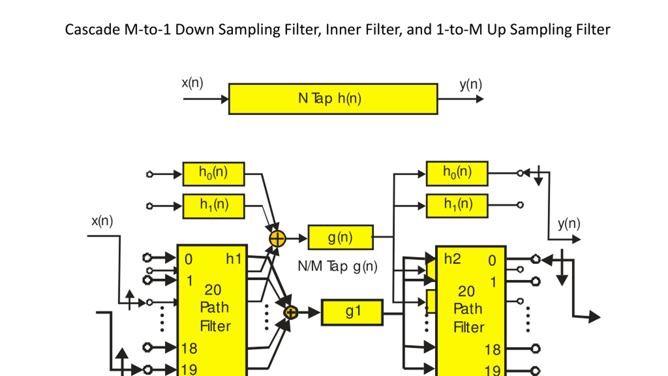 Cascade M-to-1 Down Sampling Filter, Inner Filter, and 1-to-M Up Sampling Filter x(n) y(n) N T ap h(n) h (n) 0 h (n) 0 h (n) 1 h (n) 1 x(n) y(n) g(n) h1 h2 0 1 0 1 N/M T ap g(n) H (n) H 20 Path Filter 18 (n) M-1 20 Path Filter M-1 .... .... .... .... H (n) M H (n) M g1 18 19 19