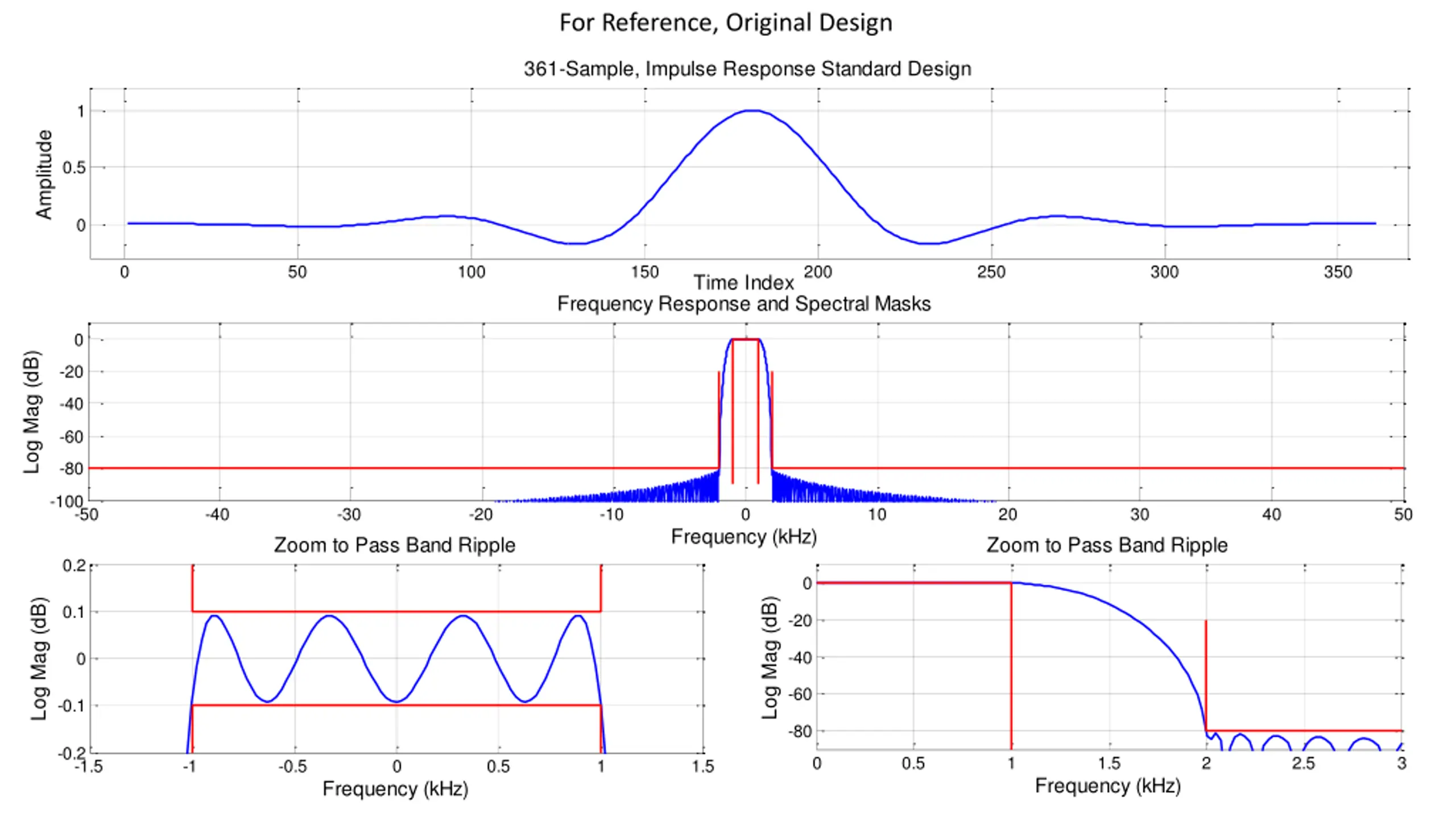 For Reference, Original Design 361-Sample, Impulse Response Standard Design 1 Amplitude 0.5 0 0 50 100 150 200 250 300 350 Time Index Frequency Response and Spectral Masks 0 Log Mag (dB) -20 -40 -60 -80 -100 -50 -40 -30 -20 -10 0 10 20 30 40 50 Frequency (kHz) Zoom to Pass Band Ripple Zoom to Pass Band Ripple 0.2 0 Log Mag (dB) Log Mag (dB) 0.1 -20 -40 0 -60 -0.1 -80 -0.2 0 0.5 1 1.5 2 2.5 3 -1.5 -1 -0.5 0 0.5 1 1.5 Frequency (kHz) Frequency (kHz)