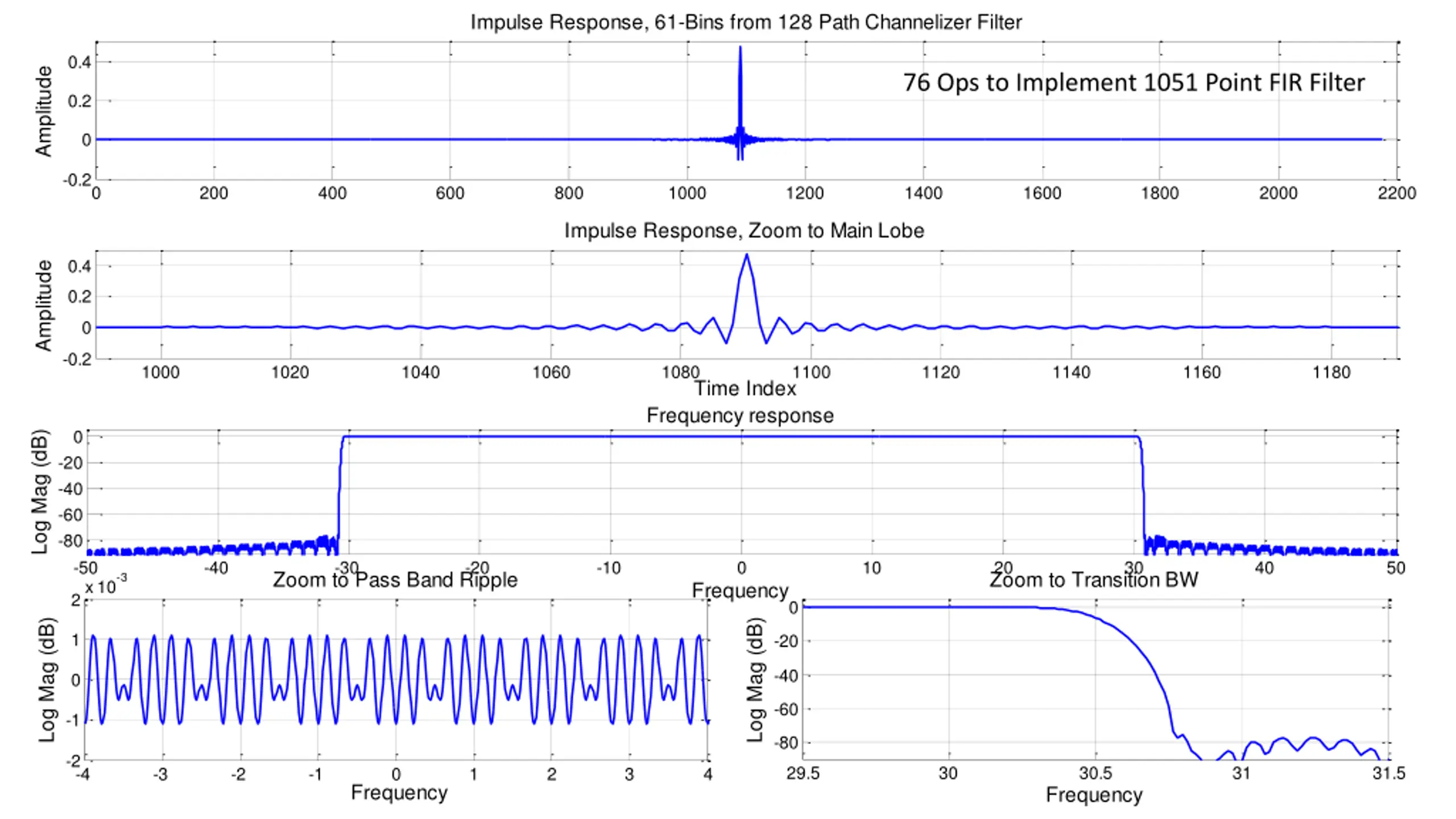 Impulse Response, 61-Bins from 128 Path Channelizer Filter 0.4 Amplitude 76 Ops to Implement 1051 Point FIR Filter 0.2 0 -0.2 0 200 400 600 800 1000 1200 1400 1600 1800 2000 2200 Impulse Response, Zoom to Main Lobe 0.4 Amplitude 0.2 0 -0.2 1000 1020 1040 1060 1080 1100 1120 1140 1160 1180 Time Index Frequency response 0 Log Mag (dB) -20 -40 -60 -80 -50 2x 10 -40 -30 -20 -10 0 10 20 Zoom to Transition BW 30 40 50 Zoom to Pass Band Ripple -3 Frequency 0 Log Mag (dB) Log Mag (dB) 1 -20 -40 0 -60 -1 -80 -2 29.5 30 30.5 31 31.5 -4 -3 -2 -1 0 1 2 3 4 Frequency Frequency