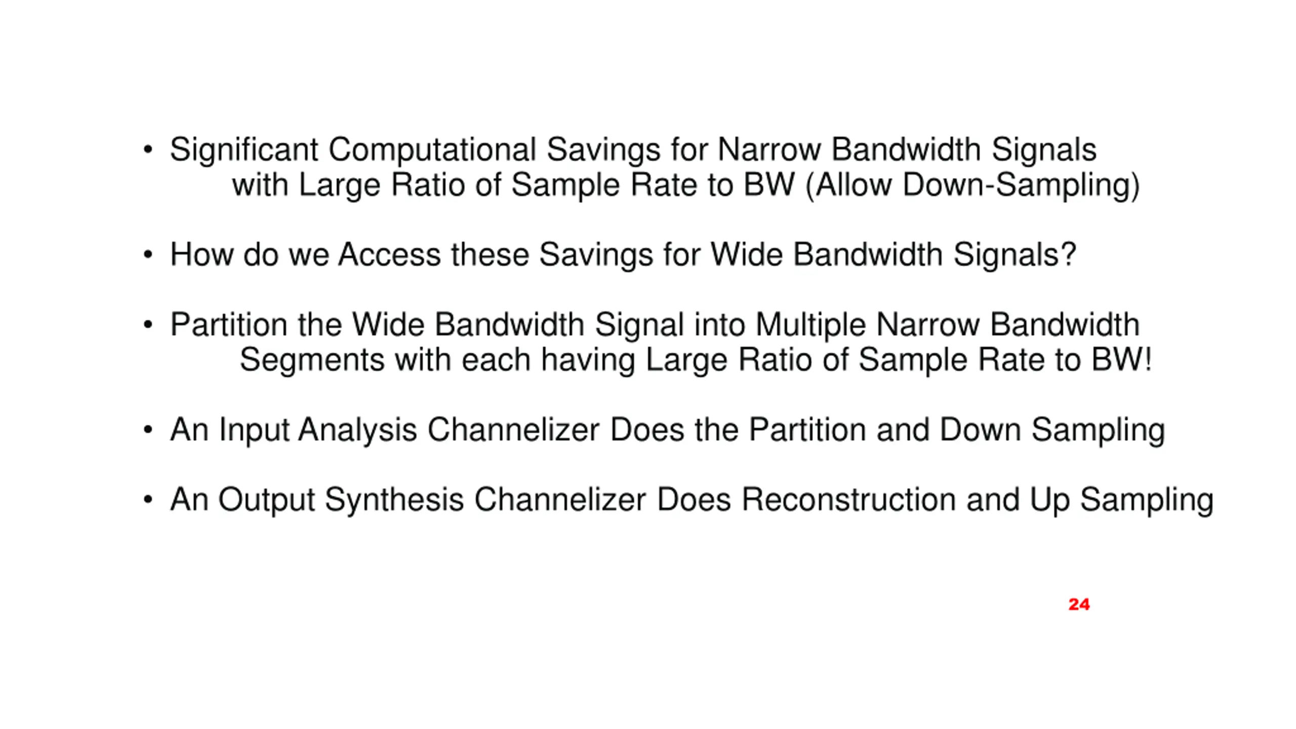 Significant Computational Savings for Narrow Bandwidth Signals with Large Ratio of Sample Rate to BW (Allow Down-Sampling) How do we Access these Savings for Wide Bandwidth Signals? Partition the Wide Bandwidth Signal into Multiple Narrow Bandwidth Segments with each having Large Ratio of Sample Rate to BW! An Input Analysis Channelizer Does the Partition and Down Sampling An Output Synthesis Channelizer Does Reconstruction and Up Sampling 24