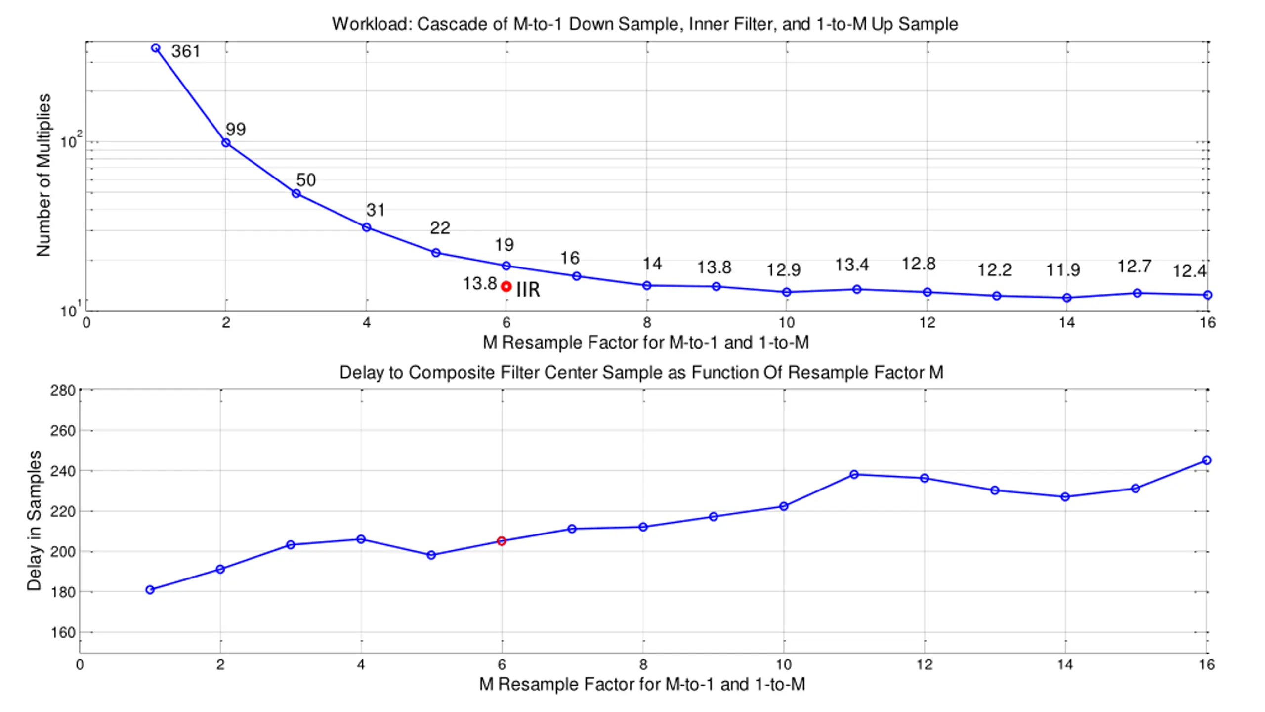 Workload: Cascade of M-to-1 Down Sample, Inner Filter, and 1-to-M Up Sample 361 Number of Multiplies 99 2 10 50 31 22 19 16 14 12.8 13.4 12.7 13.8 12.9 12.2 11.9 12.4 13.8 IIR 1 10 0 2 4 6 8 10 12 14 16 M Resample Factor for M-to-1 and 1-to-M Delay to Composite Filter Center Sample as Function Of Resample Factor M 280 260 Delay in Samples 240 220 200 180 160 0 2 4 6 8 10 12 14 16 M Resample Factor for M-to-1 and 1-to-M