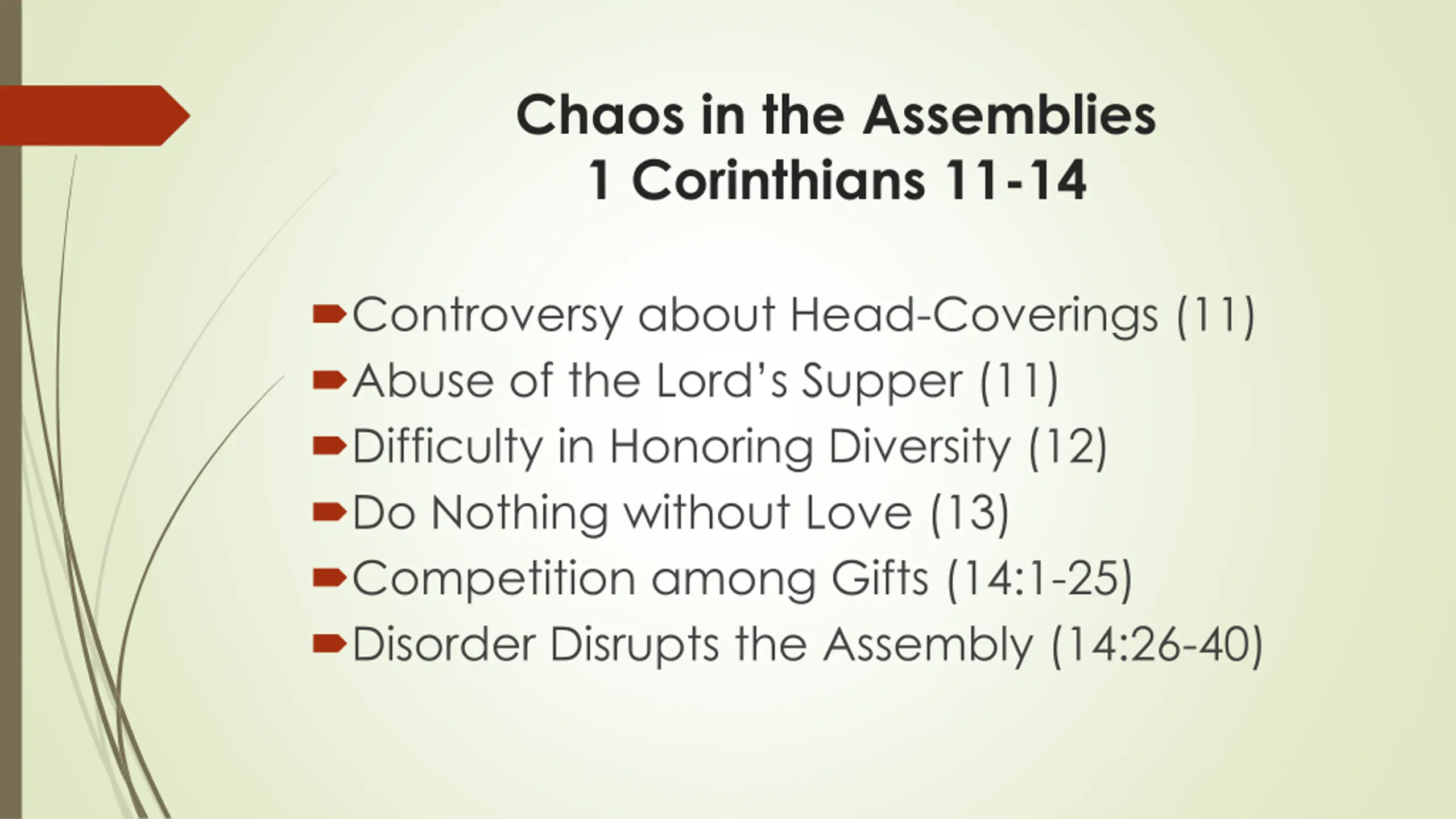 Chaos in the Assemblies 1 Corinthians 11-14 Controversy about Head-Coverings (11) Abuse of the Lord s Supper (11) Difficulty in Honoring Diversity (12) Do Nothing without Love (13) Competition among Gifts (14:1-25) Disorder Disrupts the Assembly (14:26-40)