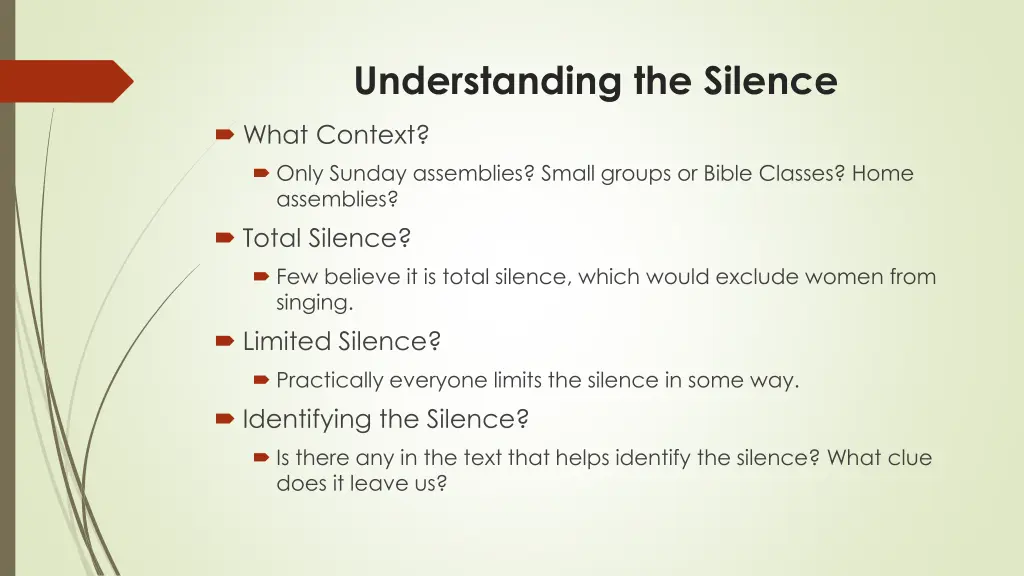 Understanding the Silence What Context? Only Sunday assemblies? Small groups or Bible Classes? Home assemblies? Total Silence? Few believe it is total silence, which would exclude women from singing. Limited Silence? Practically everyone limits the silence in some way. Identifying the Silence? Is there any in the text that helps identify the silence? What clue does it leave us?