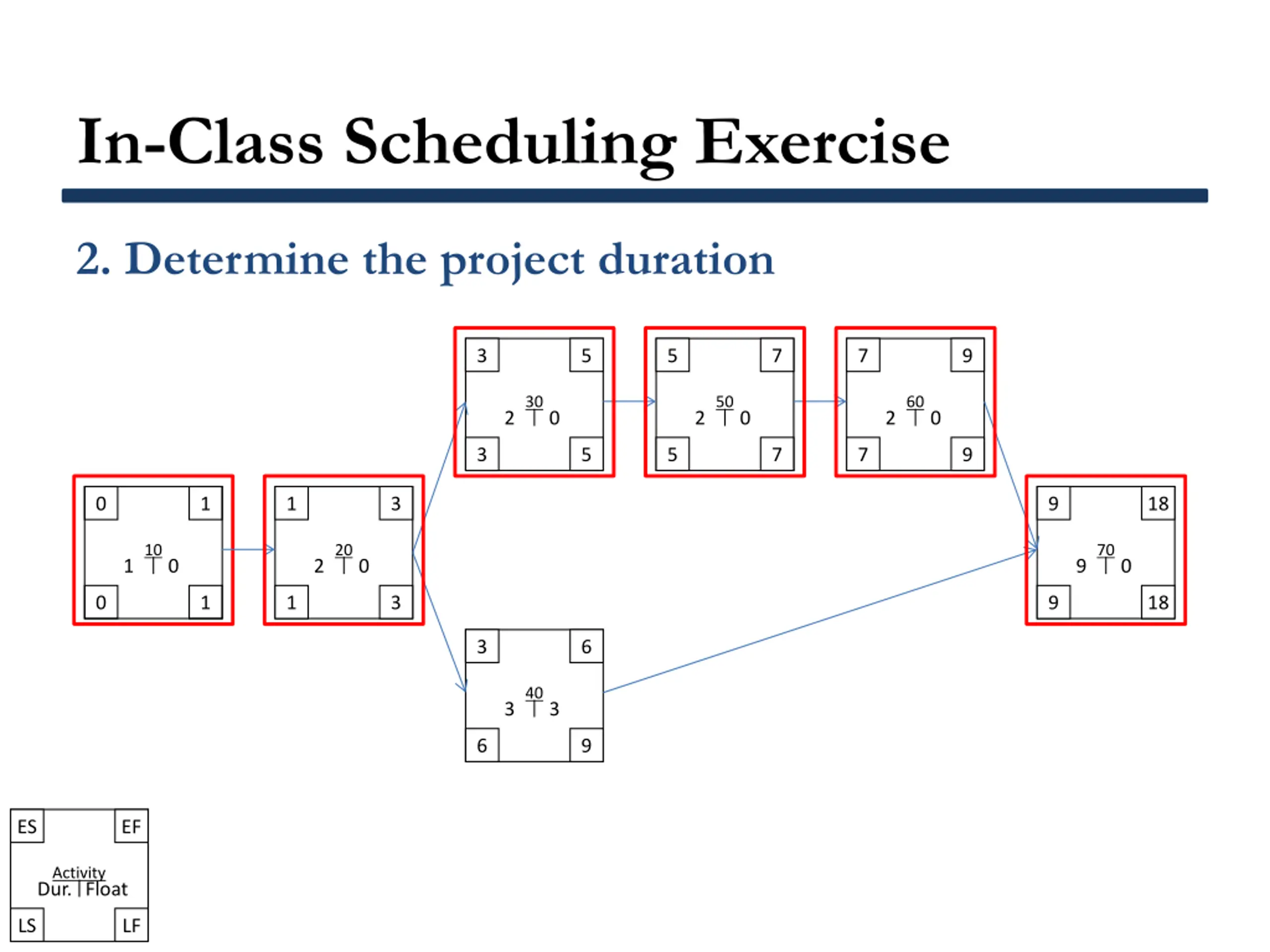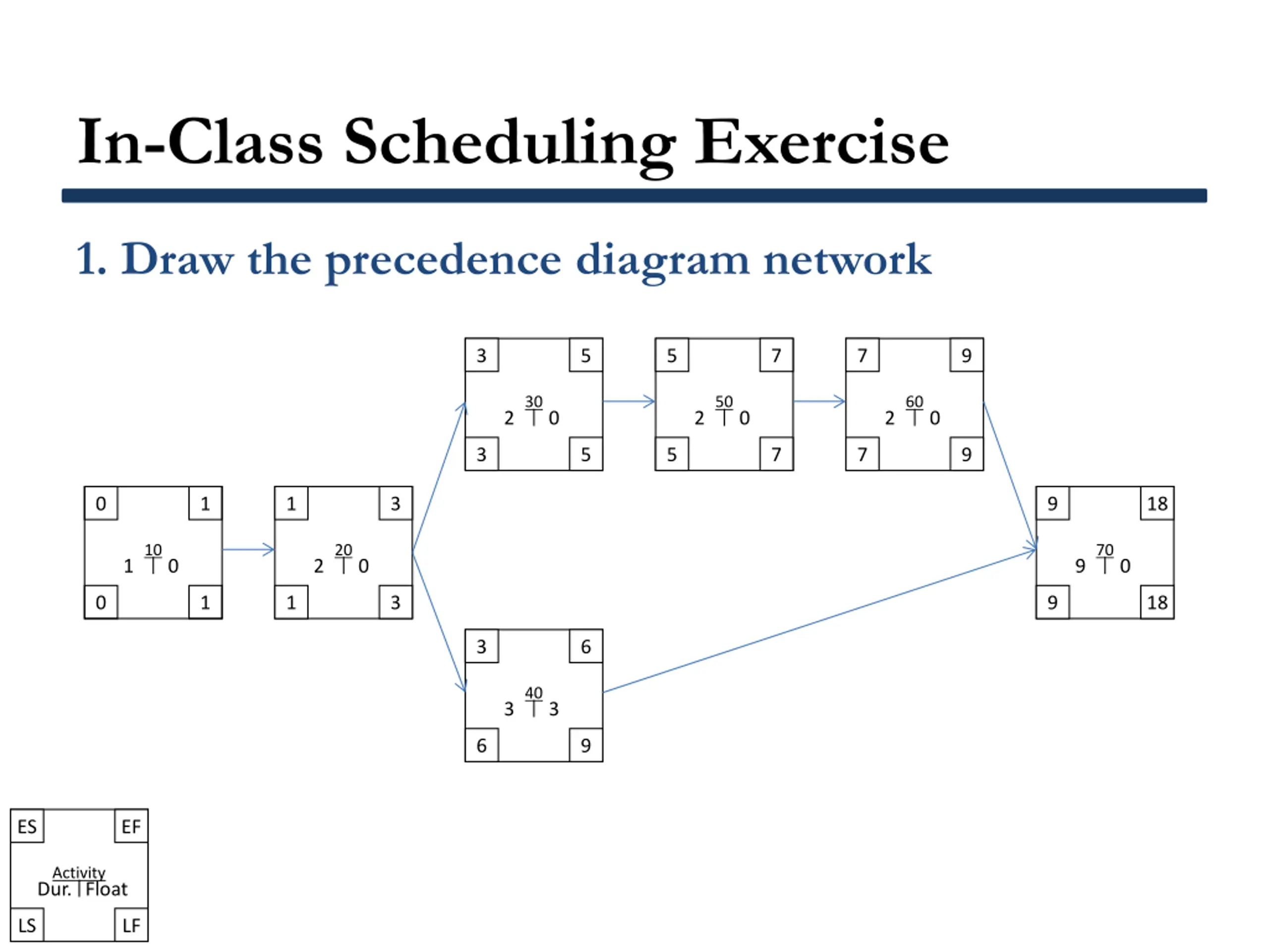 In-Class Scheduling Exercise 1. Draw the precedence diagram network 3 5 5 7 7 9 30 50 60 2 0 2 0 2 0 3 5 5 7 7 9 0 1 1 3 9 18 10 20 70 1 0 2 0 9 0 0 1 1 3 9 18 3 6 40 3 3 6 9 ES EF Activity Dur. Float LS LF