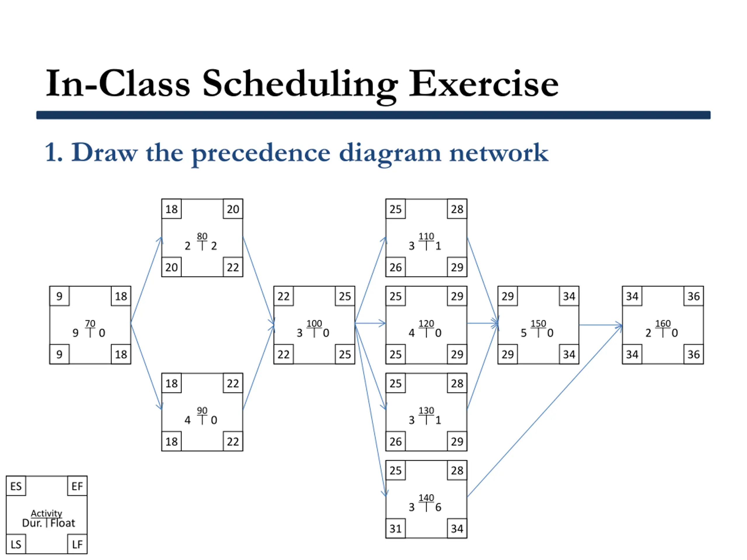 In-Class Scheduling Exercise 1. Draw the precedence diagram network 18 20 25 28 80 110 2 2 3 1 20 22 26 29 9 18 22 25 25 29 29 34 34 36 70 100 120 150 160 9 0 3 0 4 0 5 0 2 0 9 18 22 25 25 29 29 34 34 36 18 22 25 28 90 130 4 0 3 1 18 22 26 29 25 28 ES EF 140 3 6 Activity Dur. Float 31 34 LS LF