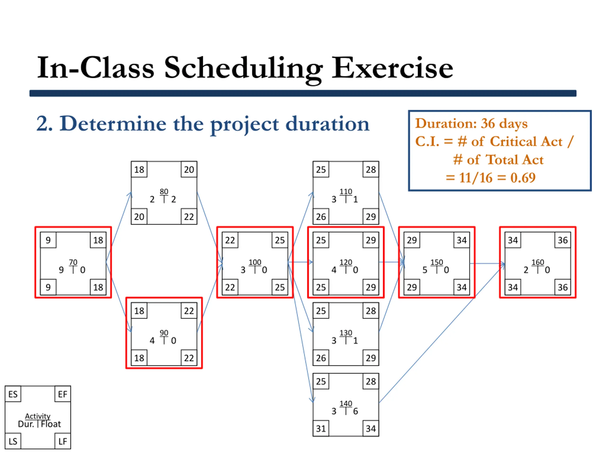 In-Class Scheduling Exercise 2. Determine the project duration Duration: 36 days C.I. = # of Critical Act / # of Total Act = 11/16 = 0.69 18 20 25 28 80 110 2 2 3 1 20 22 26 29 9 18 22 25 25 29 29 34 34 36 70 100 120 150 160 9 0 3 0 4 0 5 0 2 0 9 18 22 25 25 29 29 34 34 36 18 22 25 28 90 130 4 0 3 1 18 22 26 29 25 28 ES EF 140 3 6 Activity Dur. Float 31 34 LS LF