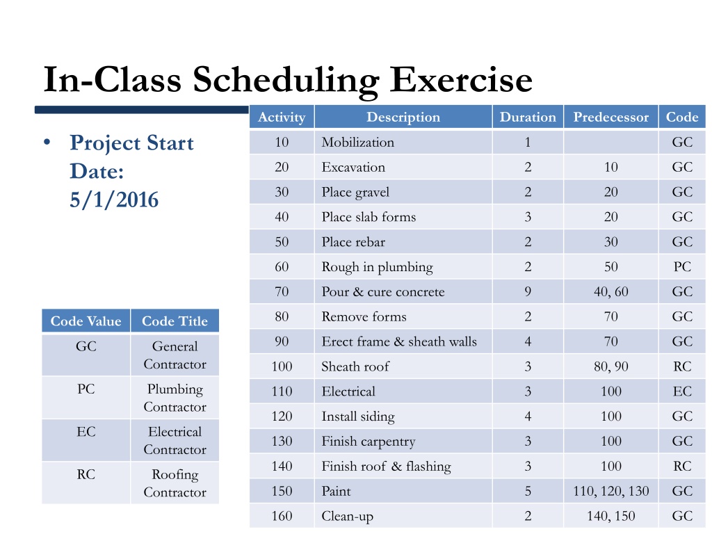 In-Class Scheduling Exercise Activity Description Duration Predecessor Code Project Start Date: 5/1/2016 10 Mobilization 1 GC 20 Excavation 2 10 GC 30 Place gravel 2 20 GC 40 Place slab forms 3 20 GC 50 Place rebar 2 30 GC 60 Rough in plumbing 2 50 PC 70 Pour & cure concrete 9 40, 60 GC 80 Remove forms 2 70 GC Code Value Code Title 90 Erect frame & sheath walls 4 70 GC GC General Contractor 100 Sheath roof 3 80, 90 RC PC Plumbing Contractor 110 Electrical 3 100 EC 120 Install siding 4 100 GC EC Electrical Contractor 130 Finish carpentry 3 100 GC 140 Finish roof & flashing 3 100 RC RC Roofing Contractor 150 Paint 5 110, 120, 130 GC 160 Clean-up 2 140, 150 GC