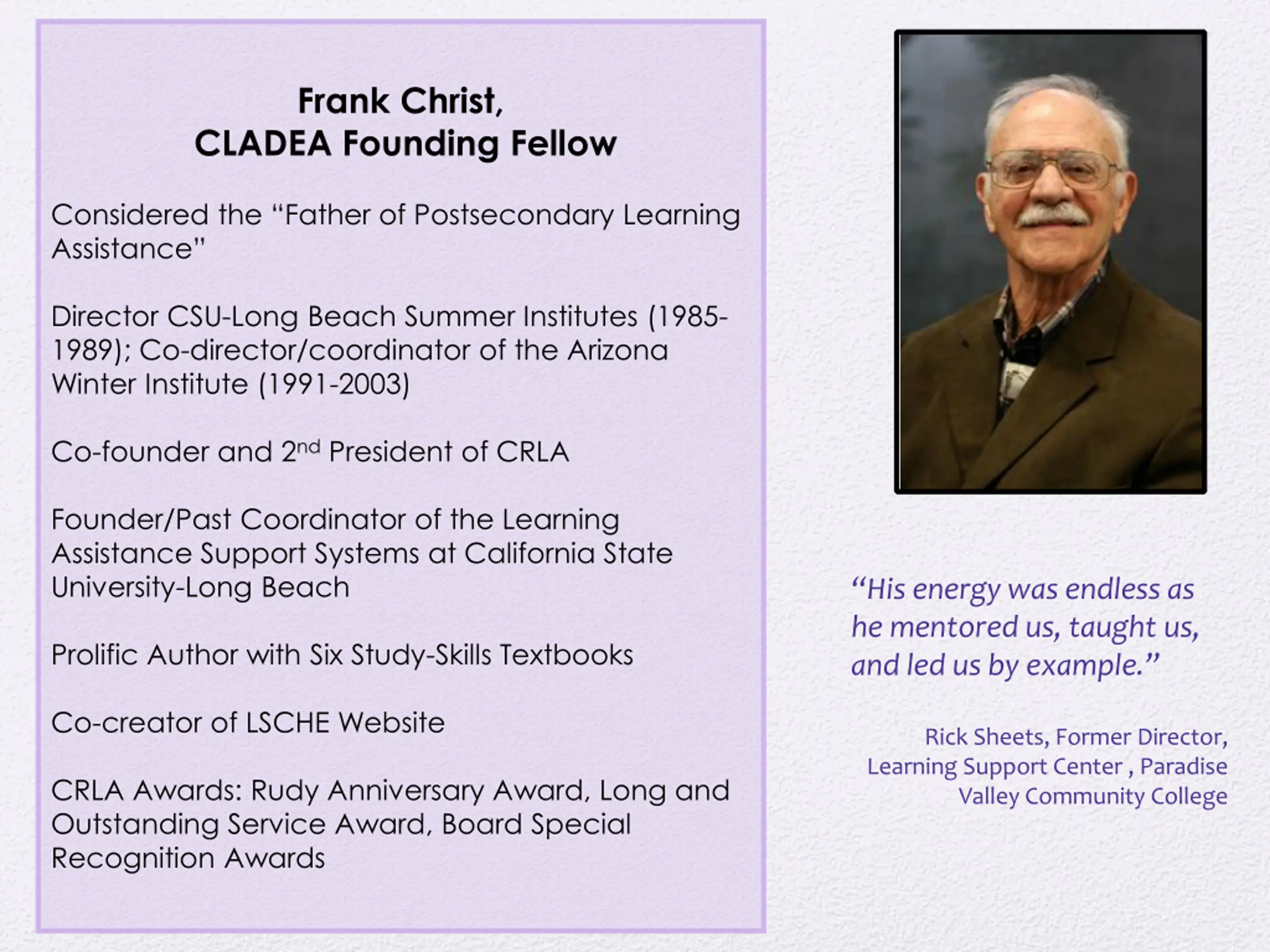 Frank Christ, CLADEA Founding Fellow Considered the Father of Postsecondary Learning Assistance Director CSU-Long Beach Summer Institutes (1985- 1989); Co-director/coordinator of the Arizona Winter Institute (1991-2003) Co-founder and 2nd President of CRLA Founder/Past Coordinator of the Learning Assistance Support Systems at California State University-Long Beach His energy was endless as he mentored us, taught us, and led us by example. Prolific Author with Six Study-Skills Textbooks Co-creator of LSCHE Website Rick Sheets, Former Director, Learning Support Center , Paradise Valley Community College CRLA Awards: Rudy Anniversary Award, Long and Outstanding Service Award, Board Special Recognition Awards
