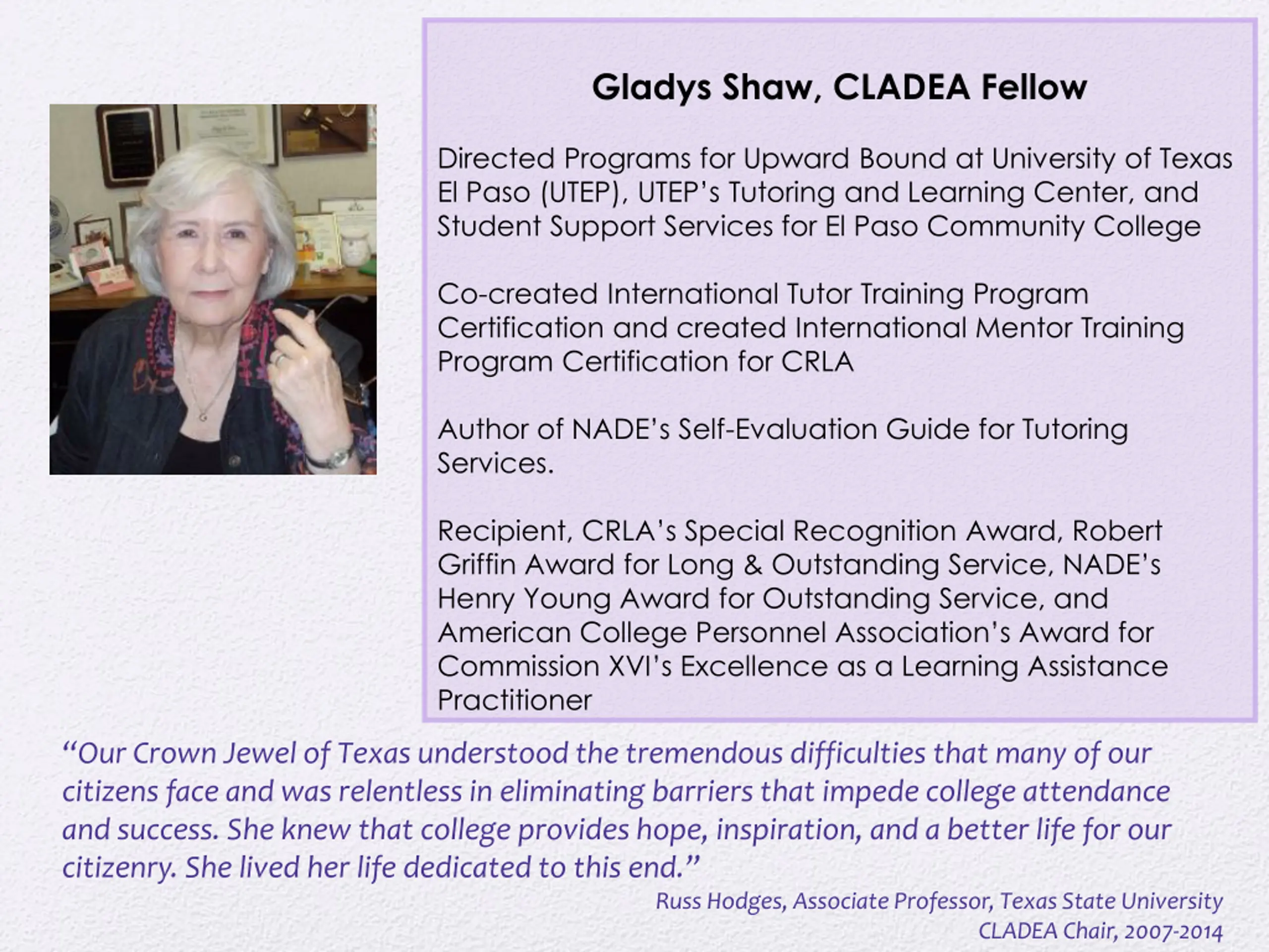 Gladys Shaw, CLADEA Fellow Directed Programs for Upward Bound at University of Texas El Paso (UTEP), UTEP s Tutoring and Learning Center, and Student Support Services for El Paso Community College Co-created International Tutor Training Program Certification and created International Mentor Training Program Certification for CRLA Author of NADE s Self-Evaluation Guide for Tutoring Services. Recipient, CRLA s Special Recognition Award, Robert Griffin Award for Long & Outstanding Service, NADE s Henry Young Award for Outstanding Service, and American College Personnel Association s Award for Commission XVI s Excellence as a Learning Assistance Practitioner Our Crown Jewel of Texas understood the tremendous difficulties that many of our citizens face and was relentless in eliminating barriers that impede college attendance and success. She knew that college provides hope, inspiration, and a better life for our citizenry. She lived her life dedicated to this end. Russ Hodges, Associate Professor, Texas State University CLADEA Chair, 2007-2014