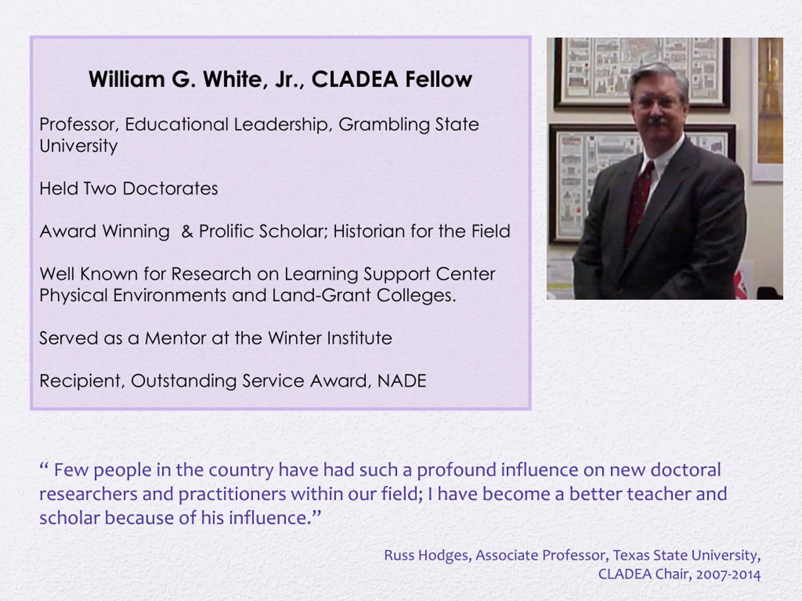 William G. White, Jr., CLADEA Fellow Professor, Educational Leadership, Grambling State University Held Two Doctorates Award Winning & Prolific Scholar; Historian for the Field Well Known for Research on Learning Support Center Physical Environments and Land-Grant Colleges. Served as a Mentor at the Winter Institute Recipient, Outstanding Service Award, NADE Few people in the country have had such a profound influence on new doctoral researchers and practitioners within our field; I have become a better teacher and scholar because of his influence. Russ Hodges, Associate Professor, Texas State University, CLADEA Chair, 2007-2014