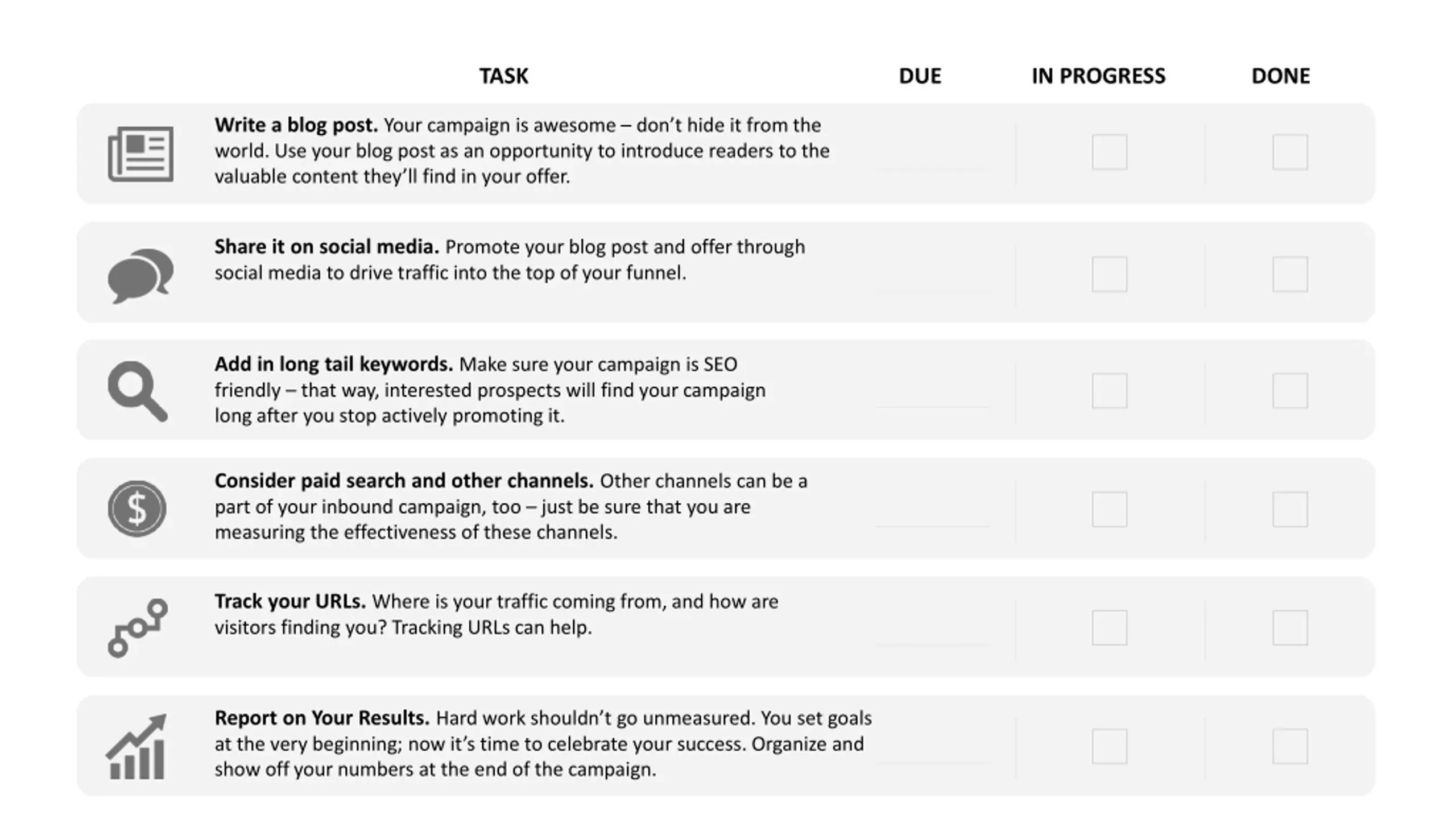 TASK DUE IN PROGRESS DONE Write a blog post. Your campaign is awesome don t hide it from the world. Use your blog post as an opportunity to introduce readers to the valuable content they ll find in your offer. Share it on social media. Promote your blog post and offer through social media to drive traffic into the top of your funnel. Add in long tail keywords. Make sure your campaign is SEO friendly that way, interested prospects will find your campaign long after you stop actively promoting it. Consider paid search and other channels. Other channels can be a part of your inbound campaign, too just be sure that you are measuring the effectiveness of these channels. Track your URLs. Where is your traffic coming from, and how are visitors finding you? Tracking URLs can help. Report on Your Results. Hard work shouldn t go unmeasured. You set goals at the very beginning; now it s time to celebrate your success. Organize and show off your numbers at the end of the campaign.