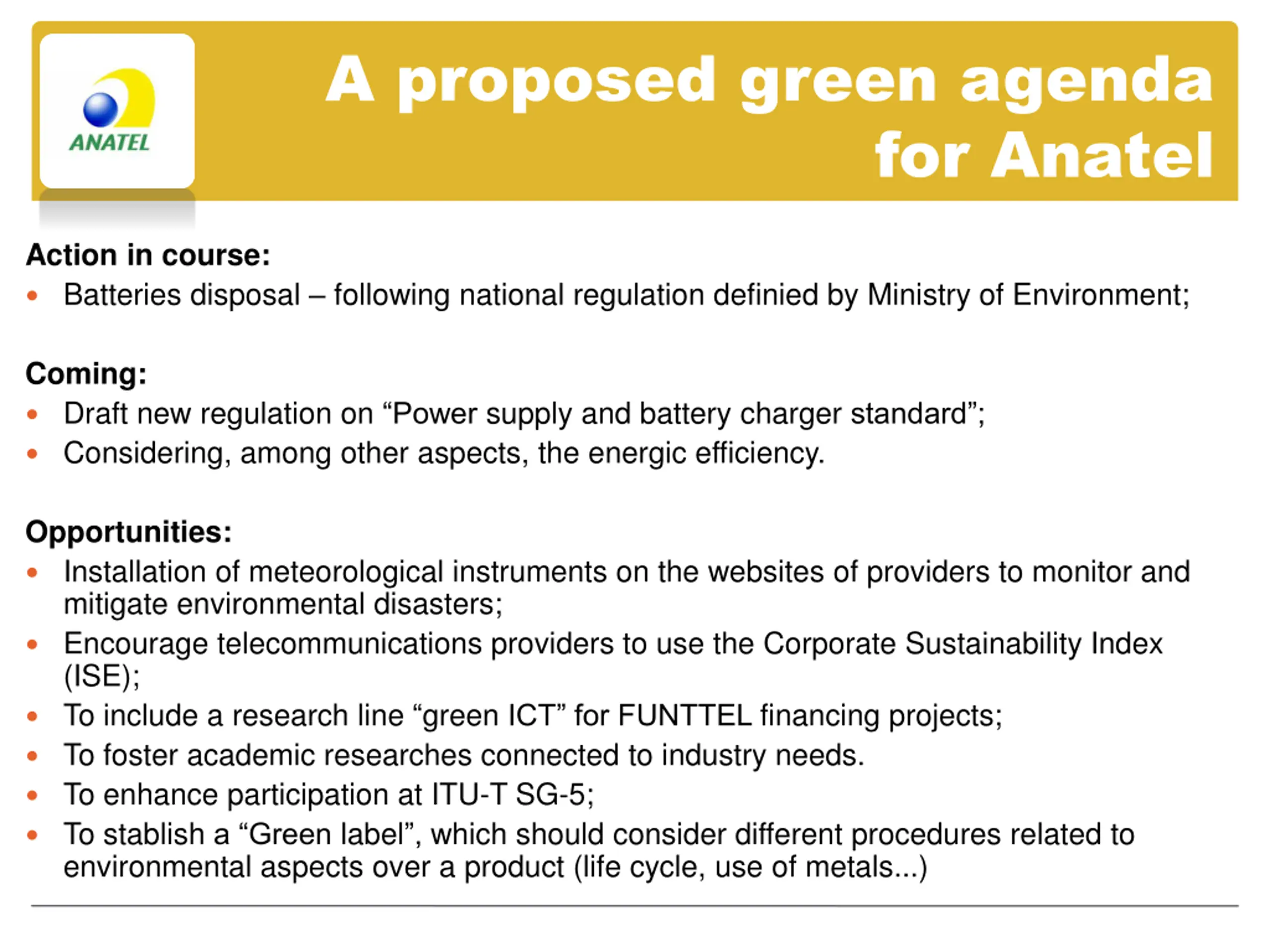 A proposed green agenda for Anatel Action in course: Batteries disposal following national regulation definied by Ministry of Environment; Coming: Draft new regulation on Power supply and battery charger standard ; Considering, among other aspects, the energic efficiency. Opportunities: Installation of meteorological instruments on the websites of providers to monitor and mitigate environmental disasters; Encourage telecommunications providers to use the Corporate Sustainability Index (ISE); To include a research line green ICT for FUNTTEL financing projects; To foster academic researches connected to industry needs. To enhance participation at ITU-T SG-5; To stablish a Green label , which should consider different procedures related to environmental aspects over a product (life cycle, use of metals...)